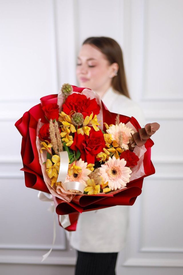 Состав: герберы, французские розы, стойкая альстромерия, скабиоза, сухоцветы, эвкалипт.