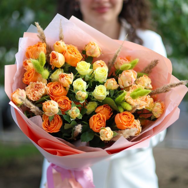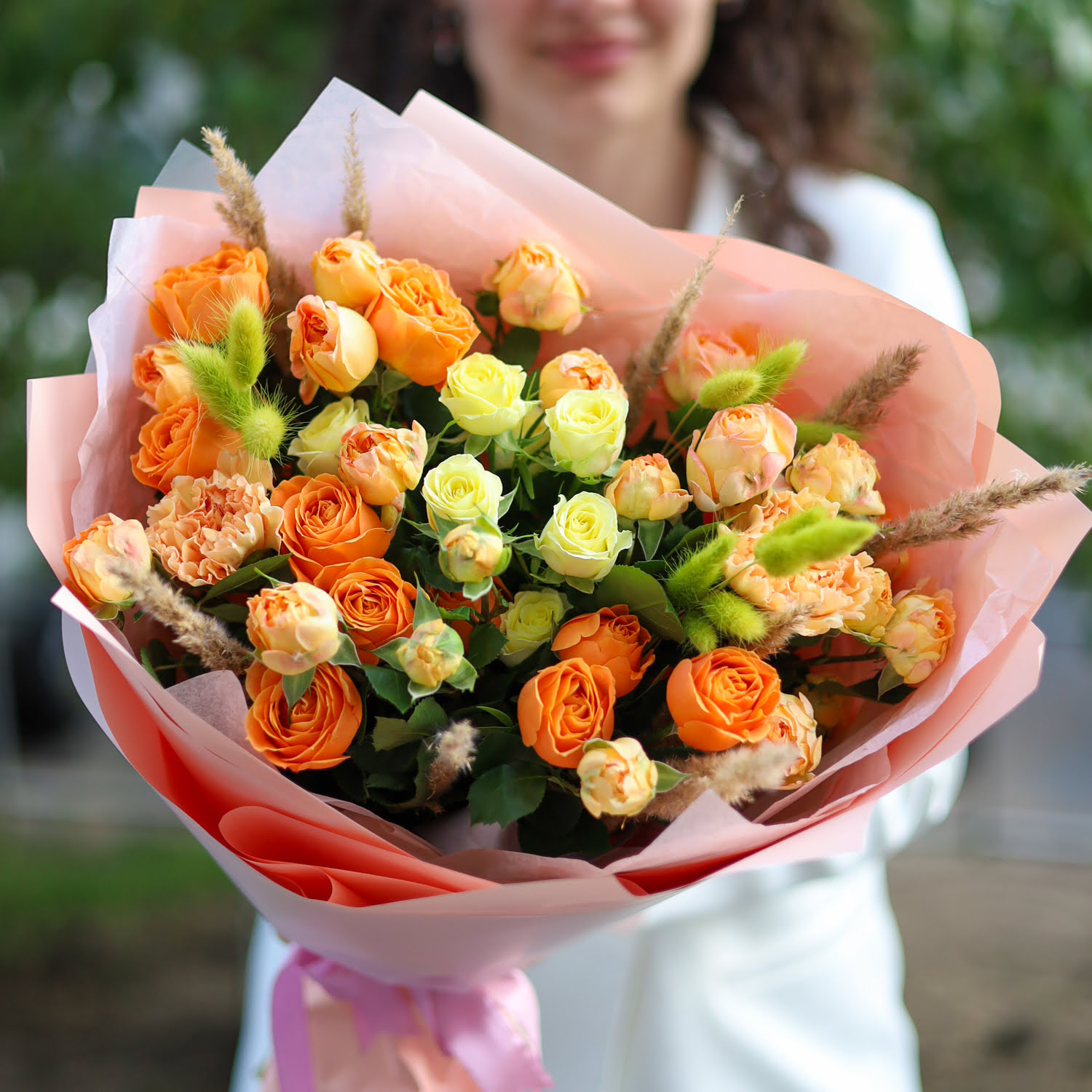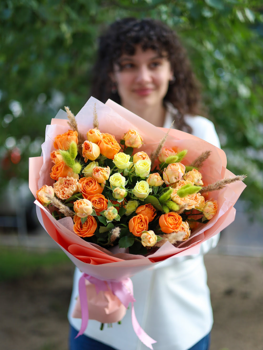 Очаровательный сборный букет в оранжево-желтой гамме в оформлении.