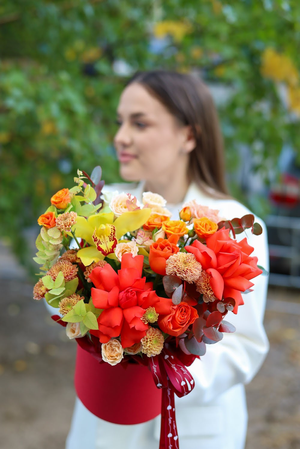 Состав: французские розы, стойкие хризантемы и орхидея, кустовые и одноголовые розы, душистый эвкалипт.