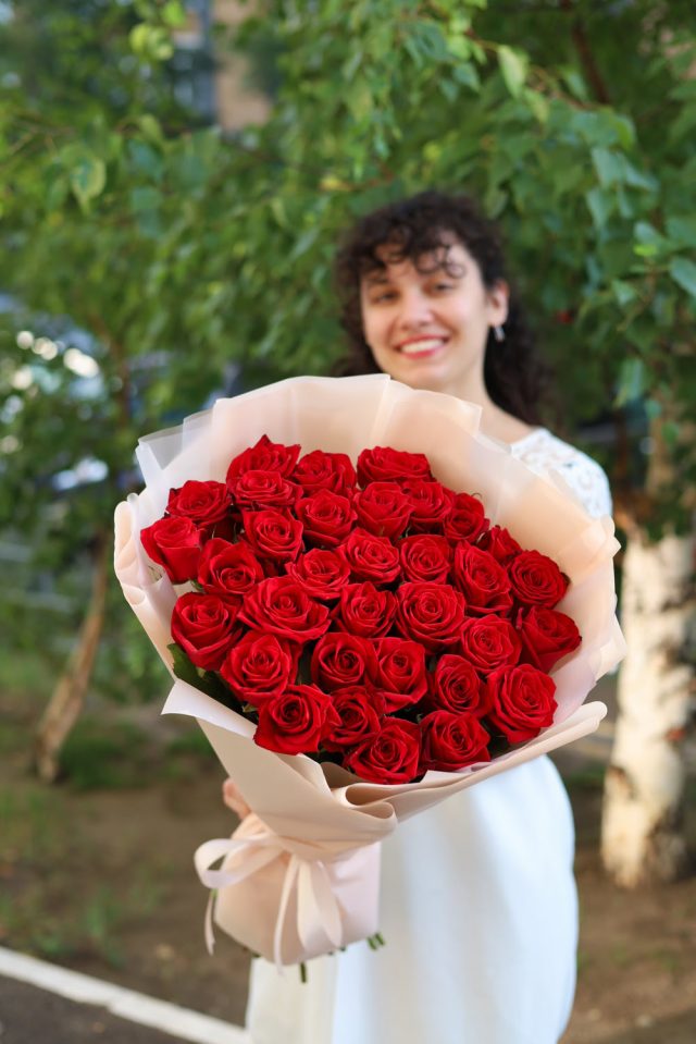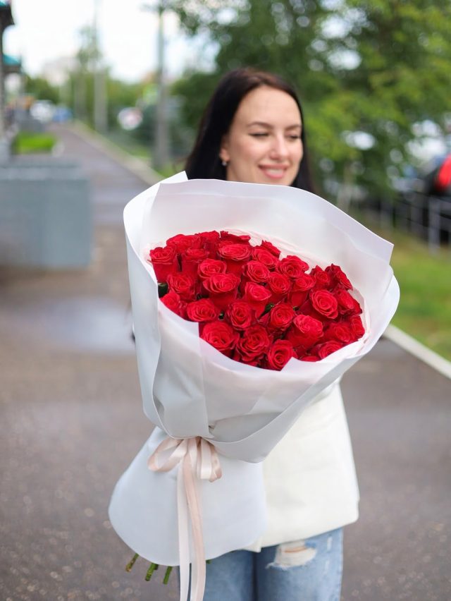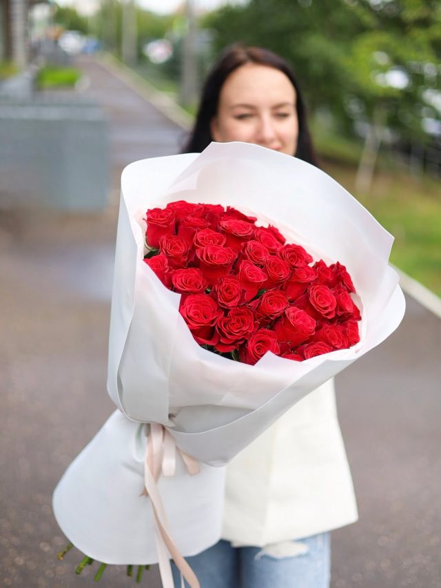 Прекрасный букет из 35-ти красных роз в дизайнерском оформлении.