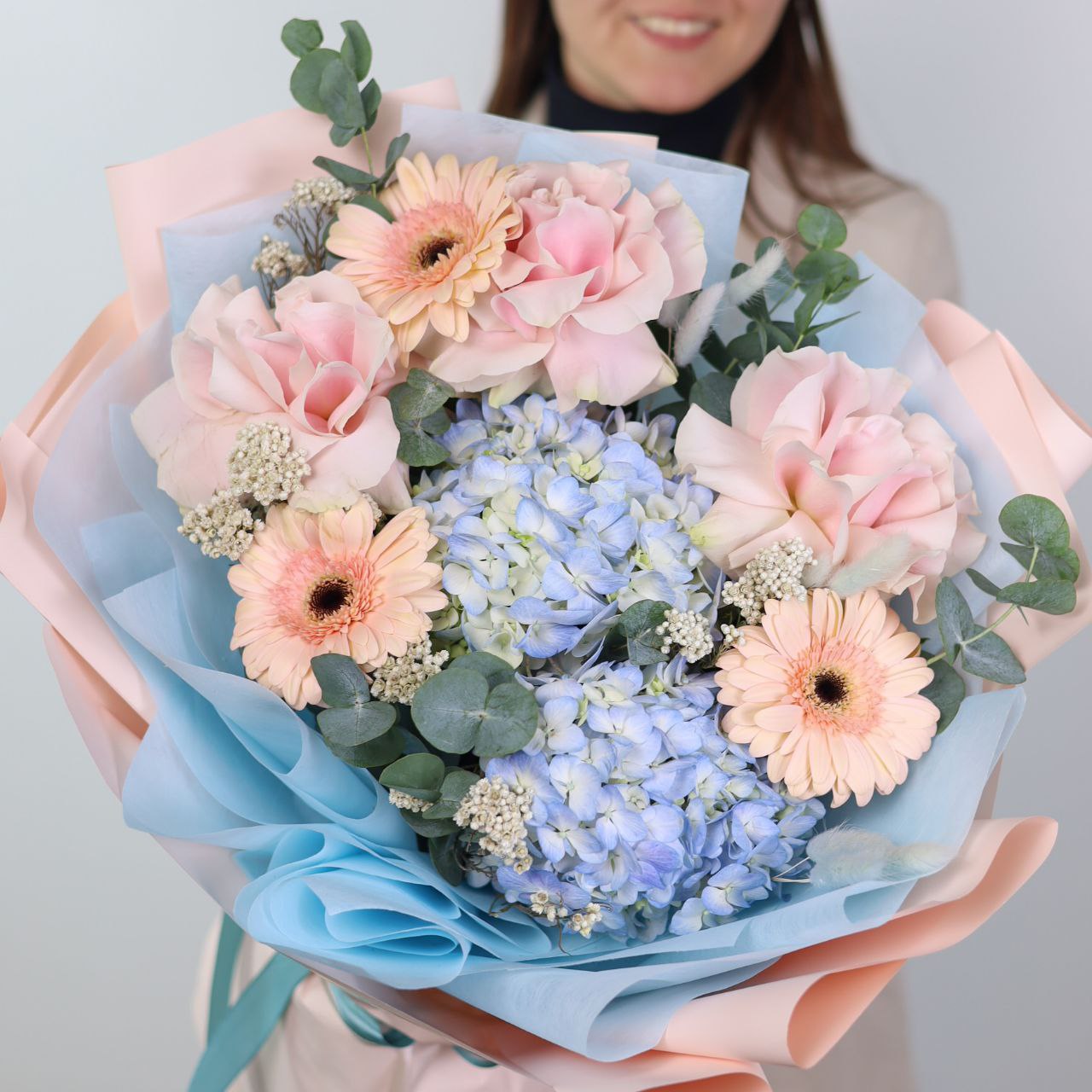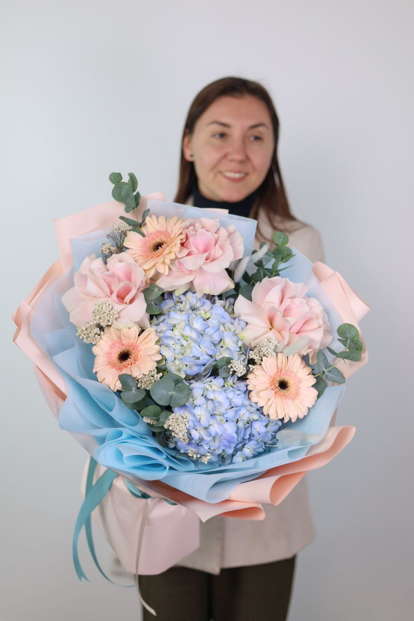 Букет с пышной гортензией, герберой, французской розой, озотамнусом и душистым эвкалиптом в оформлении.