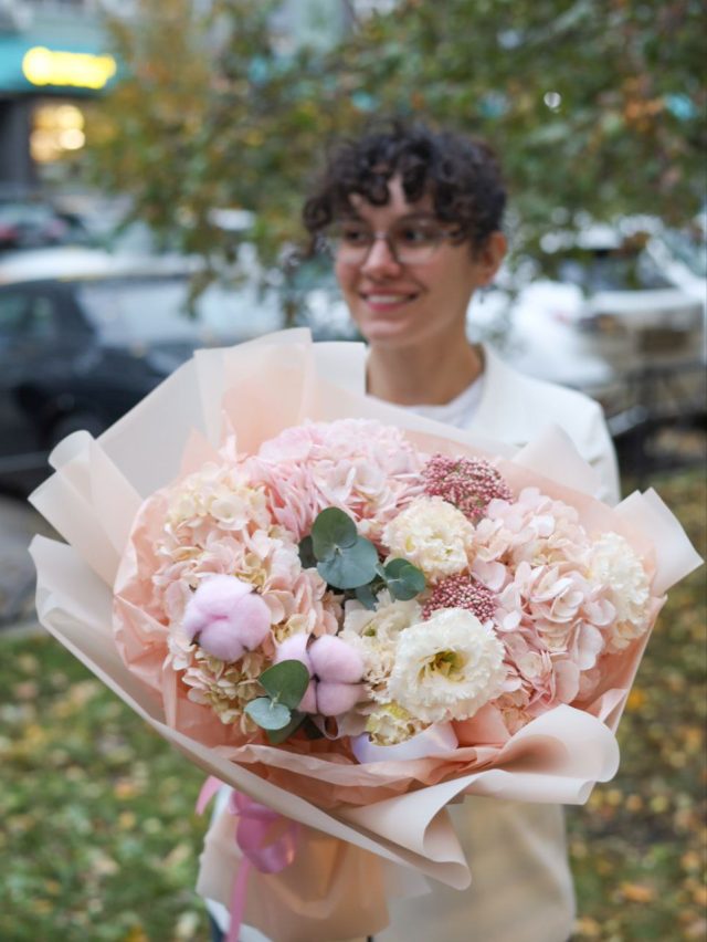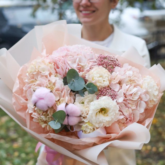 Букет с пышной гортензией, ажурной эустомой, хлопком, озатамнусом и душистым эвкалиптом в оформлении.