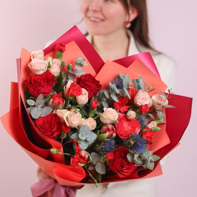 Состав: ранункулус, роза крупная и кустовая, пионовидный тюльпан, стойкий диантус, душистый эвкалипт.