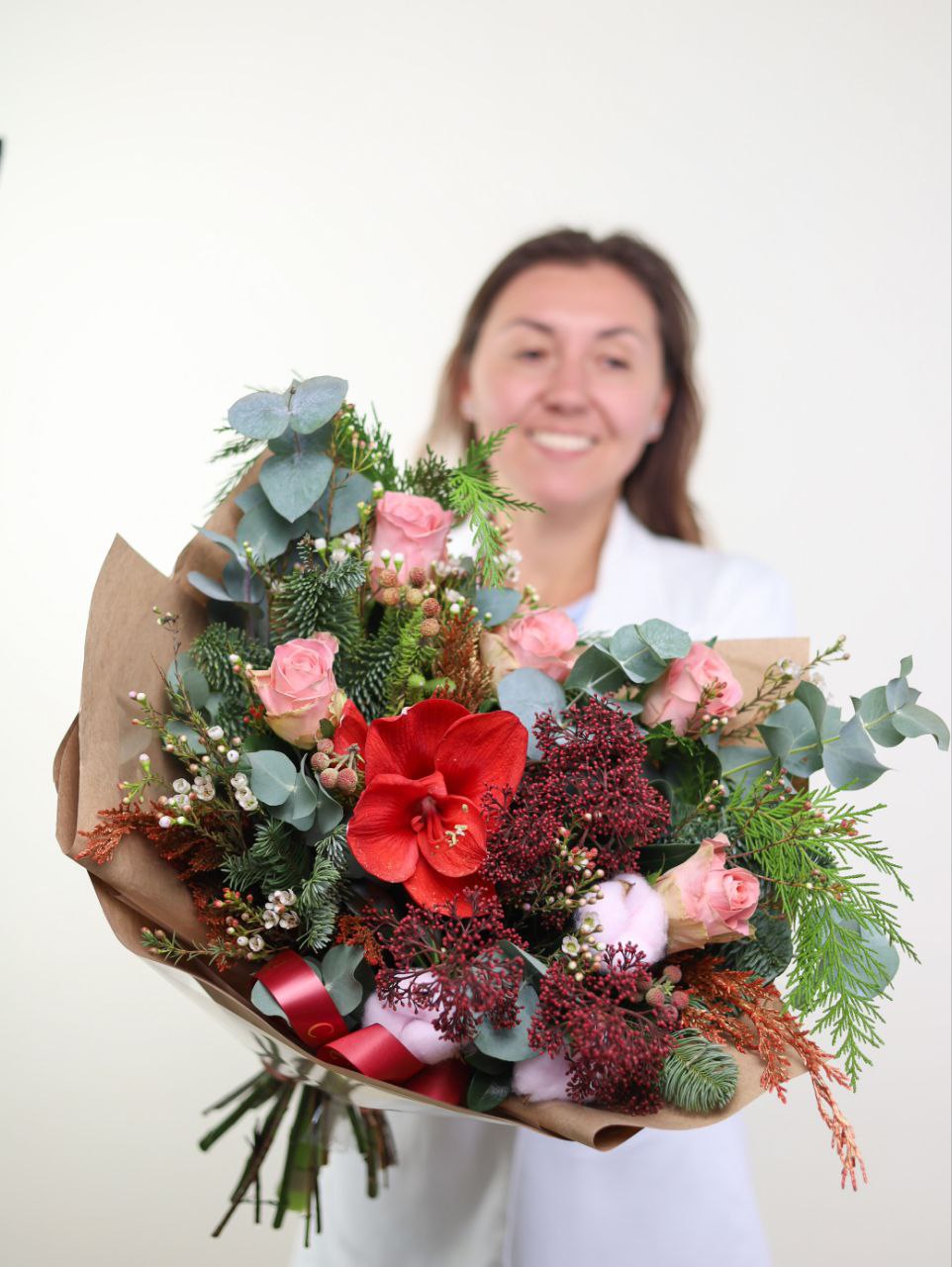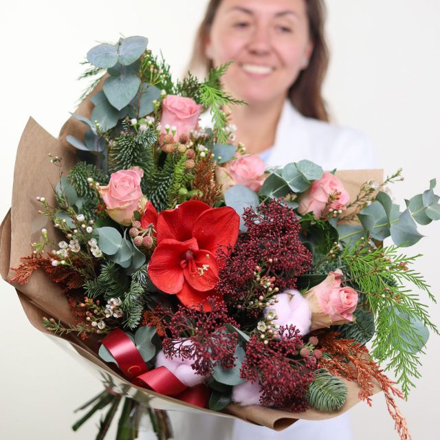 Букет с прекрасным амариллисом, розой, хамелациумом, хлопком и датской елью в оформлении.