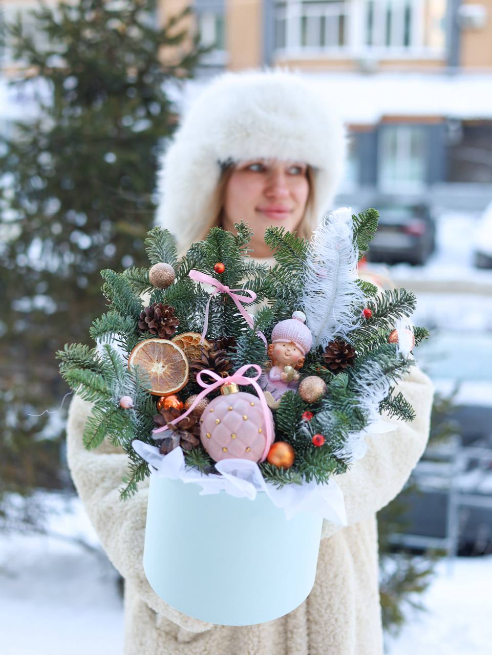 Композиция нобилиса, декоративных игрушек, апельсина, шишек и перьев в шляпной коробке.