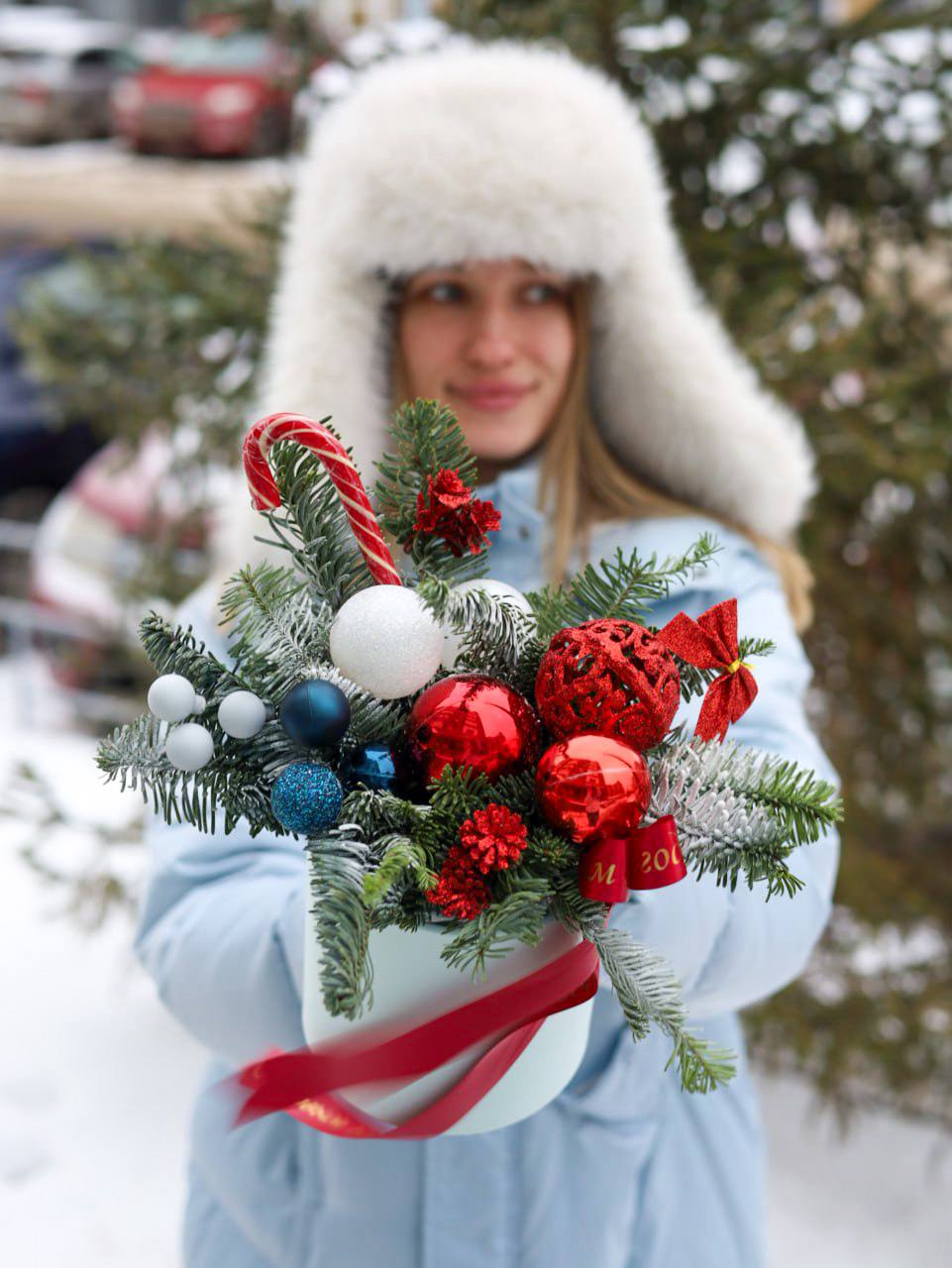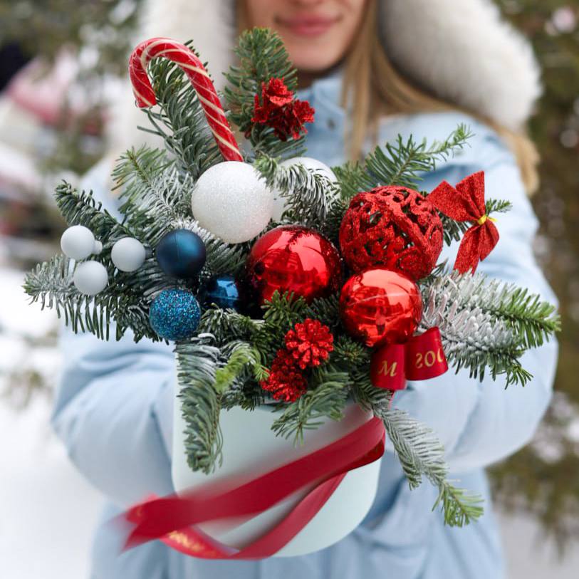 Состав: ель нобилис, игрушки, декор, леденец.
