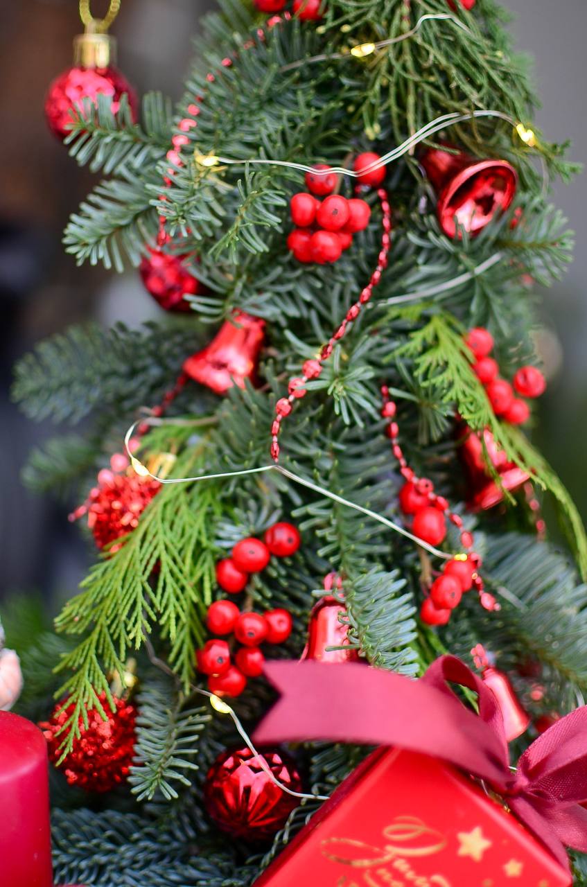 Великолепная композиция в бордовой гамме с гирляндой и декором. Композиция припорошена снегом.