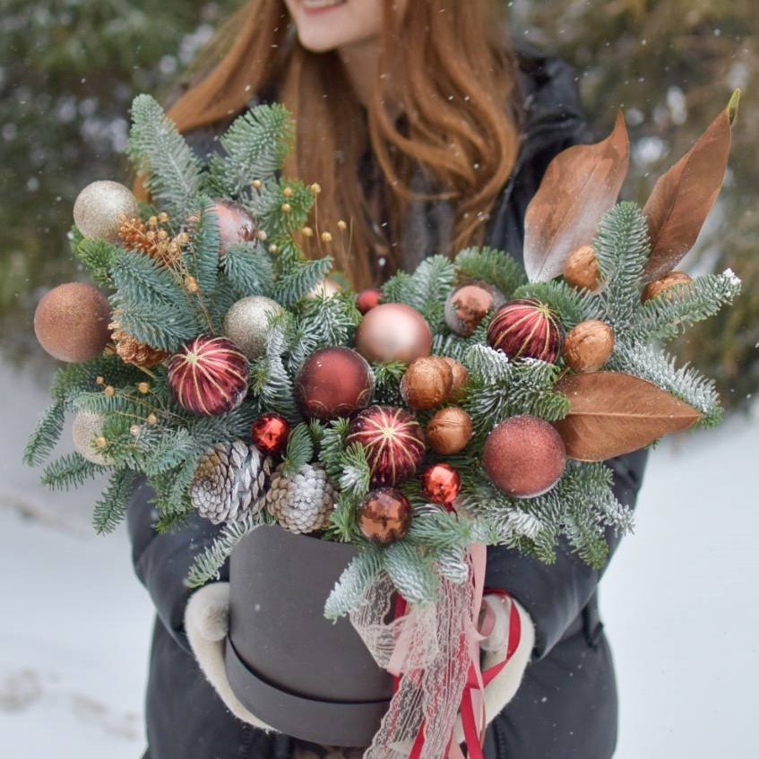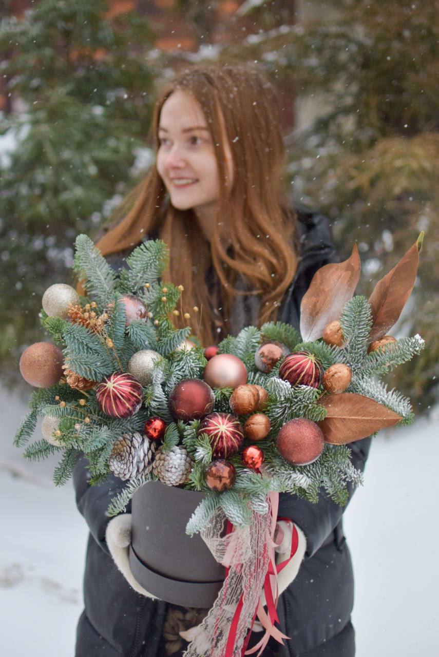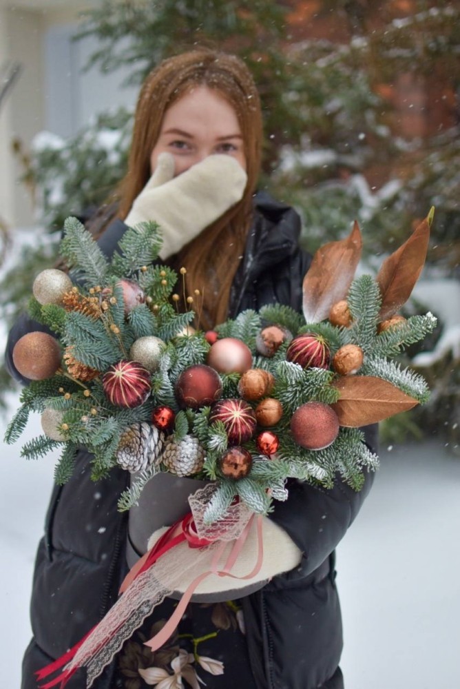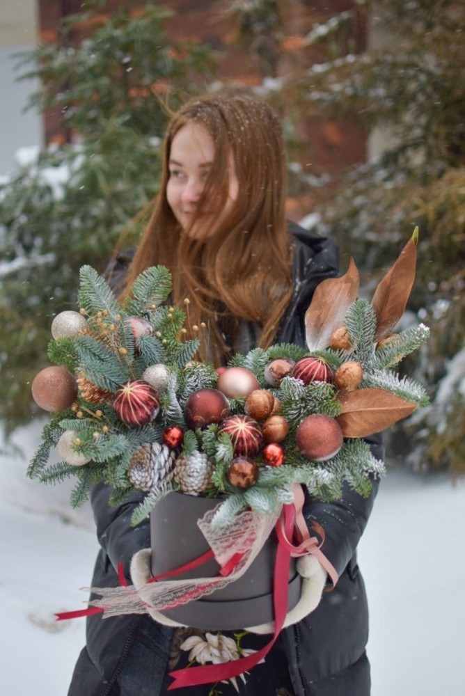 Прекрасная большая композиция с датской елью, новогодним декором и листьями магнолии. Композиция надолго запомнится своей стойкостью и утонченным видом. Высота около 45-50 см.