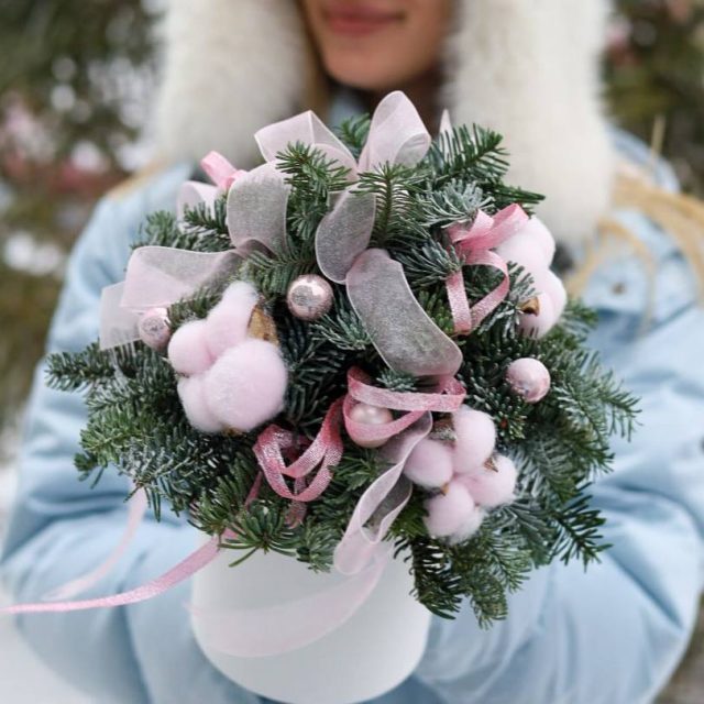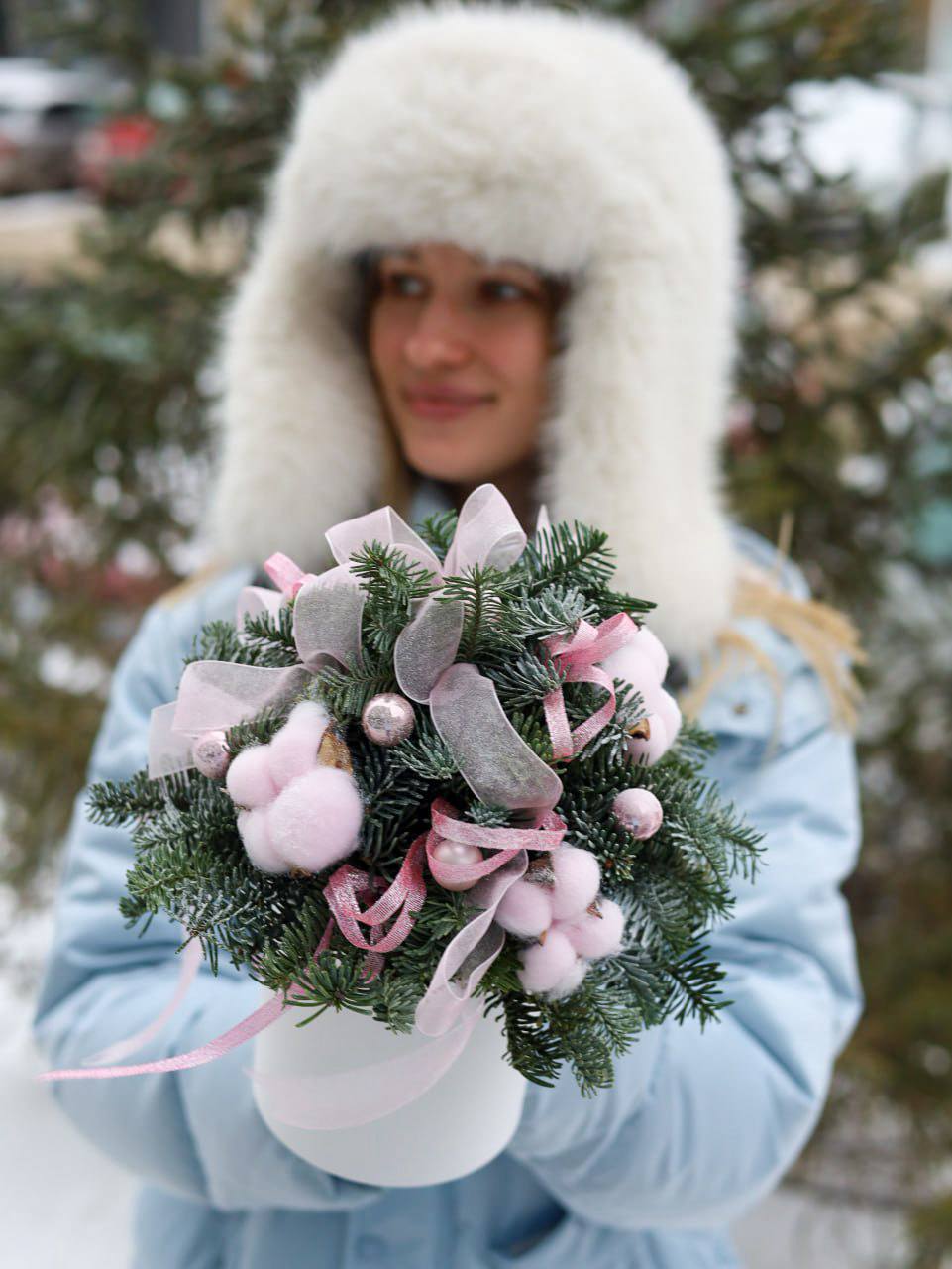 Очаровательная новогодняя композиция в нежней гамме в шляпной коробке.