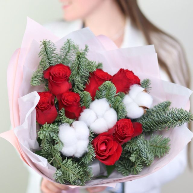 Букет стойких роз, хлопка и датской ели в оформлении.