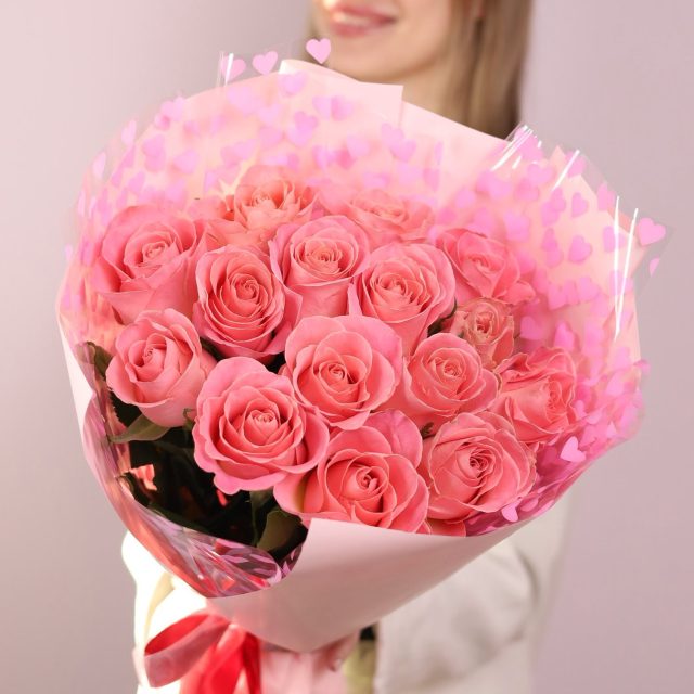 Очаровательный букет из 15-ти розовых роз Эрмоса в стильном оформлении.