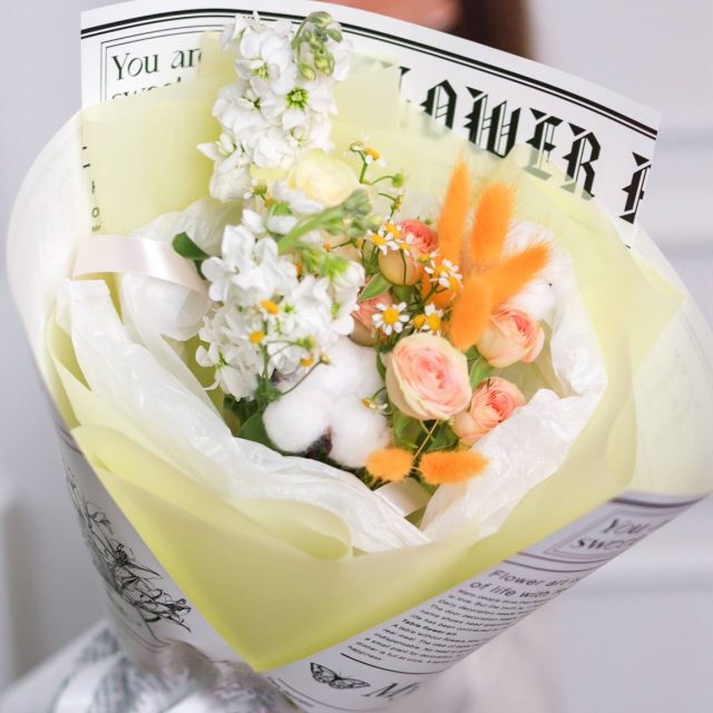 Букет ароматной маттиолы, кустовых роз, ромашек, воздушного хлопка и лагуруса в оформлении.