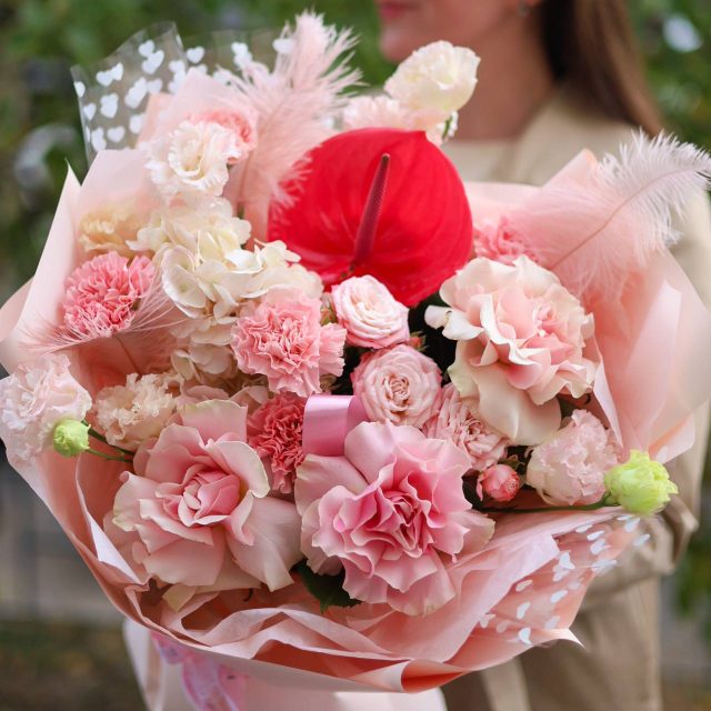 Букет пышной гортензии, экзотического антуриума, французских роз, кустовых пионовидных роз, ажурной эустомы, диантусов и перьев в оформлении.
