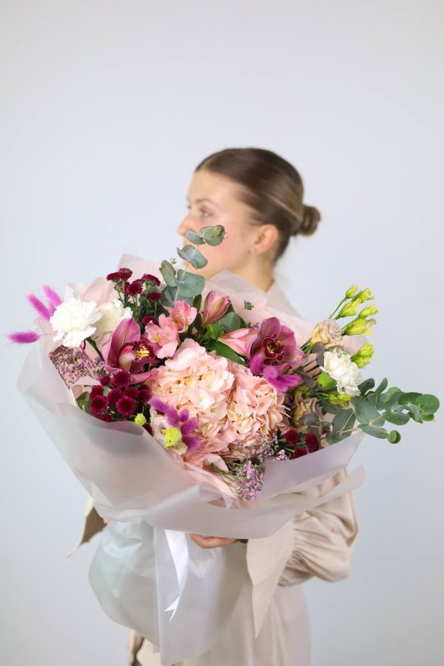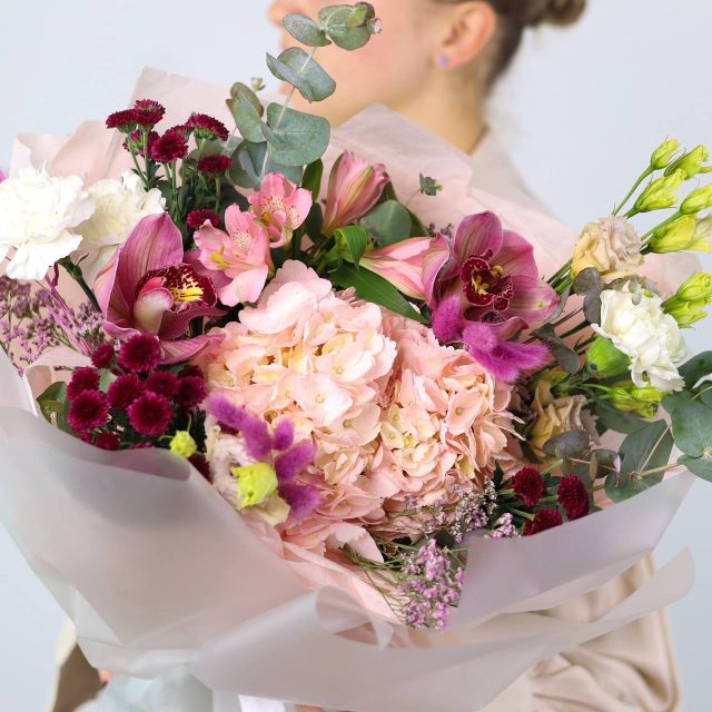 Букет пышной гортензии, стойких орхидей, ажурной эустомы, диантусов, хризантемы, лимониума, альстромерий и душистого эвкалипта в оформлении.