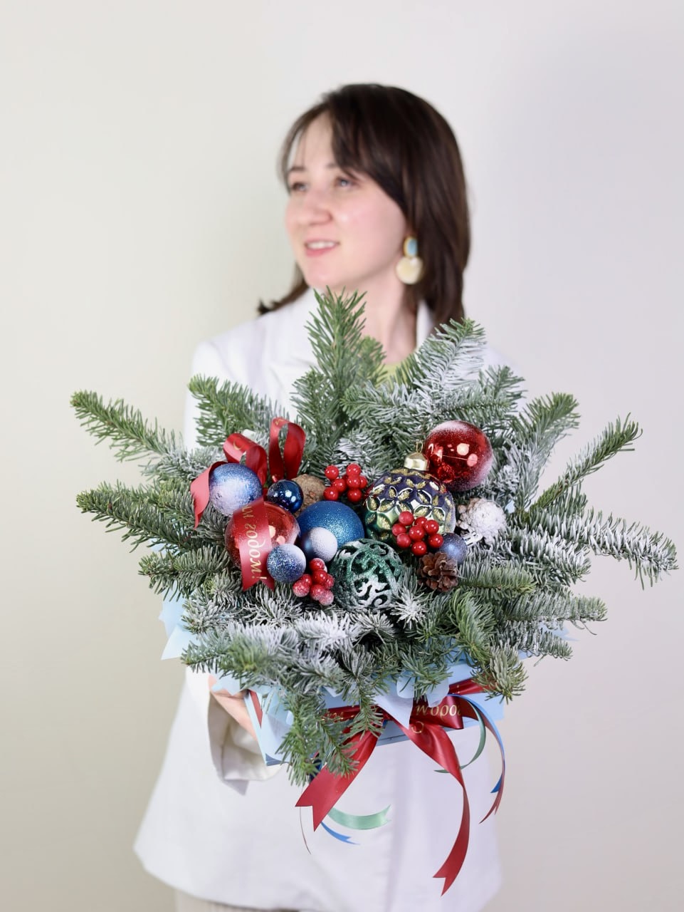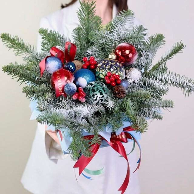 Прекрасная зимняя композиция в зимней гамме с ароматной елью, игрушками, шишками и декором.