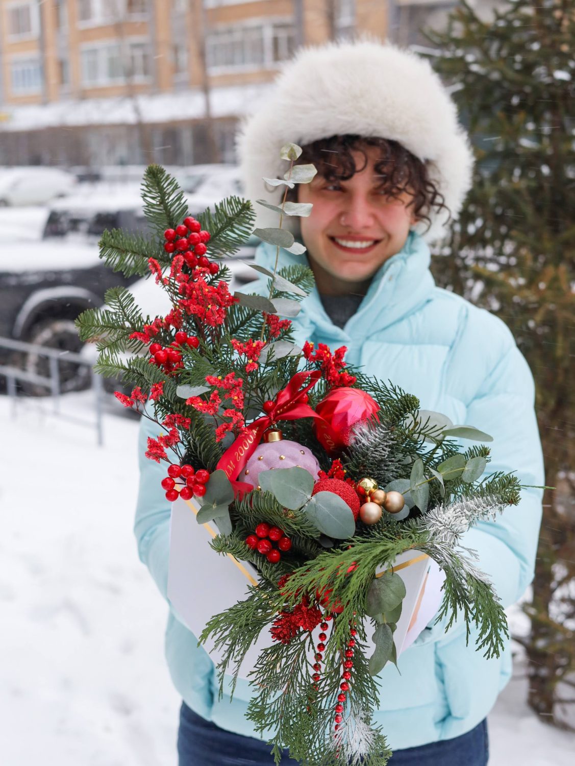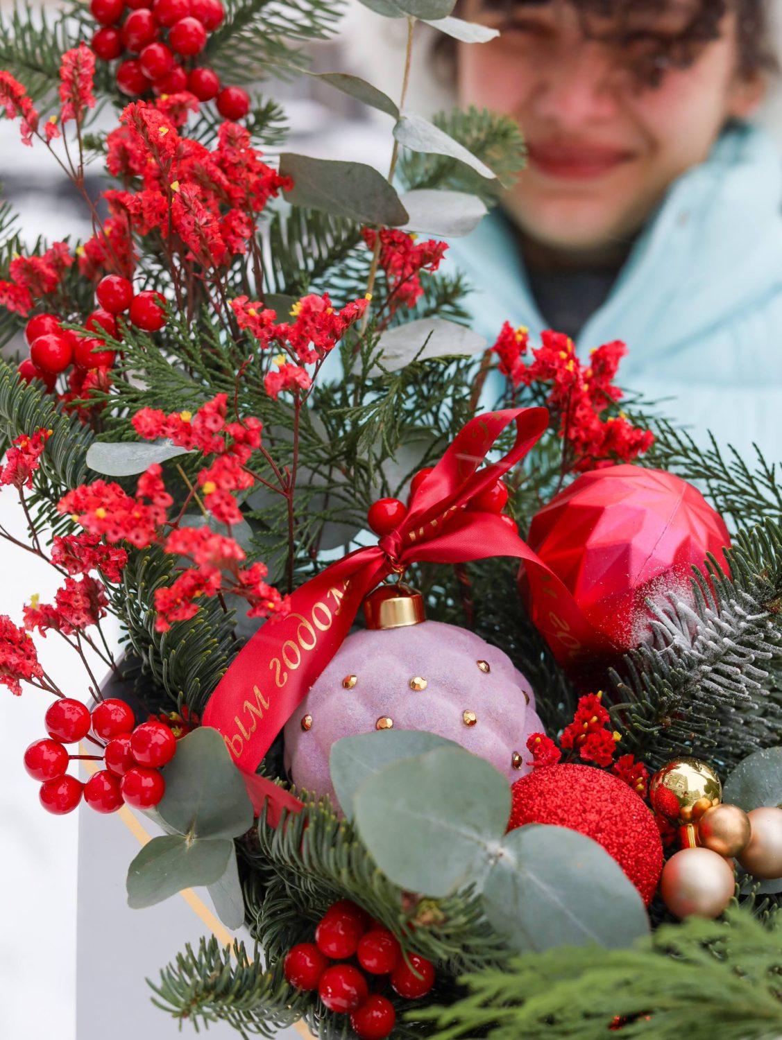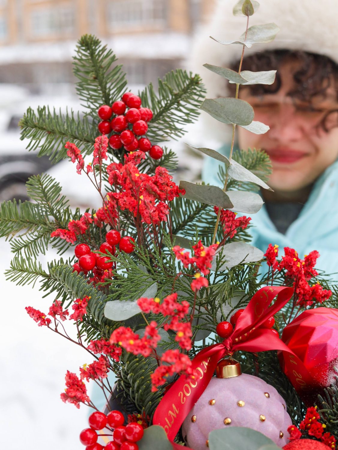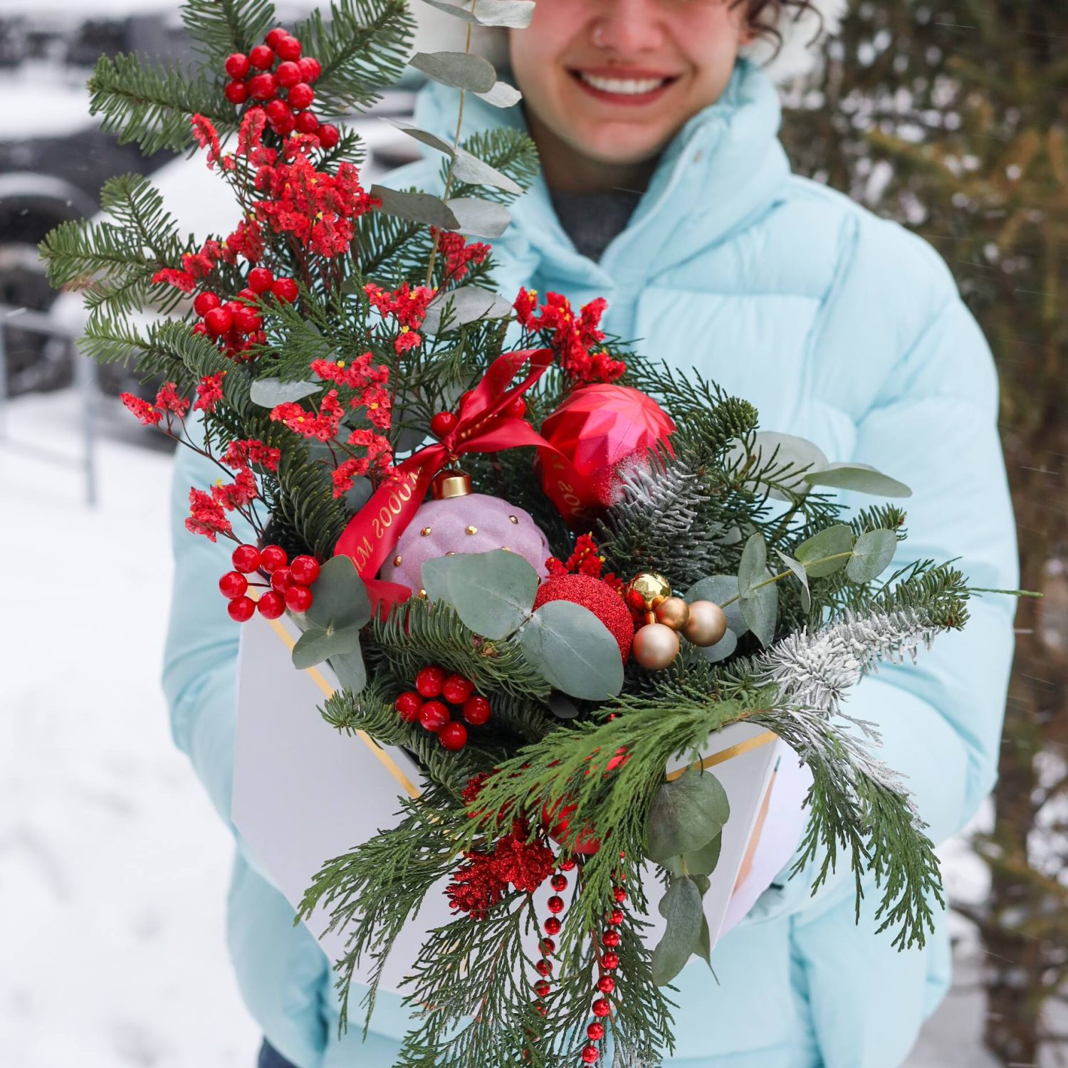 Состав: ель нобилис, туя, елочные игрушки, декор, эвкалипт.