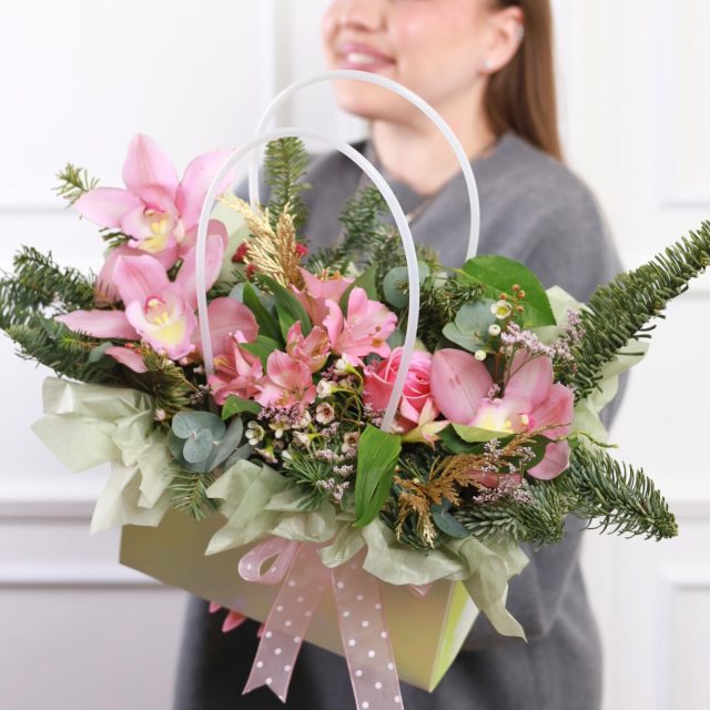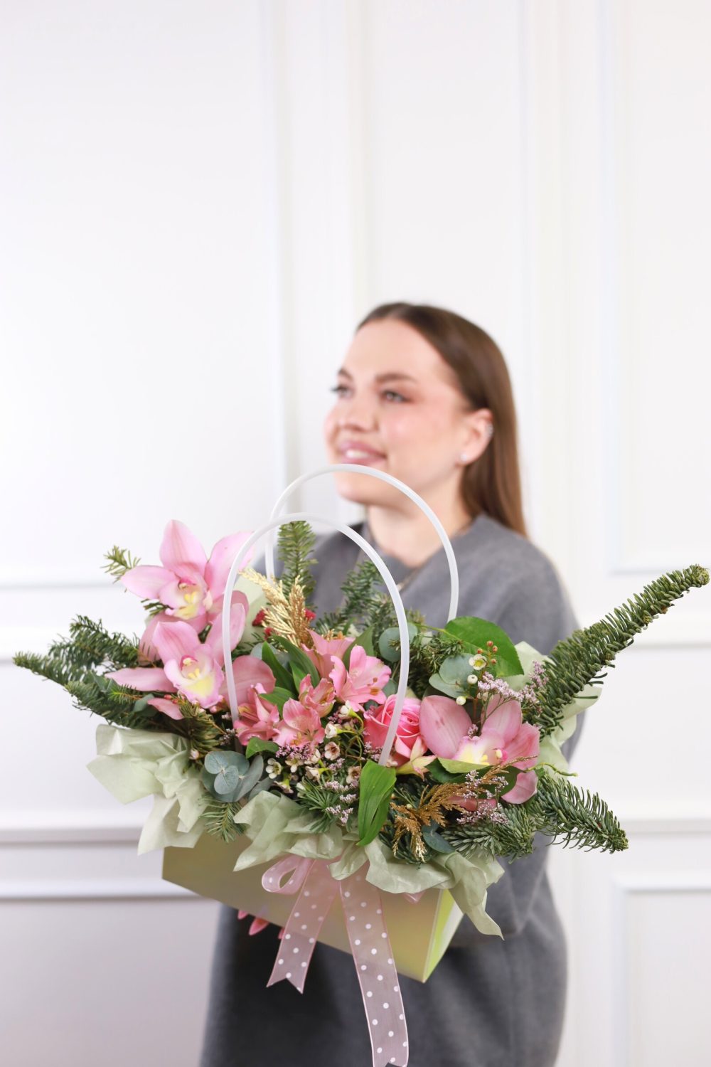Очаровательная зимняя композиция с орхидеями, розами, альстромерией, елью, хамелациумом и эвкалиптом.