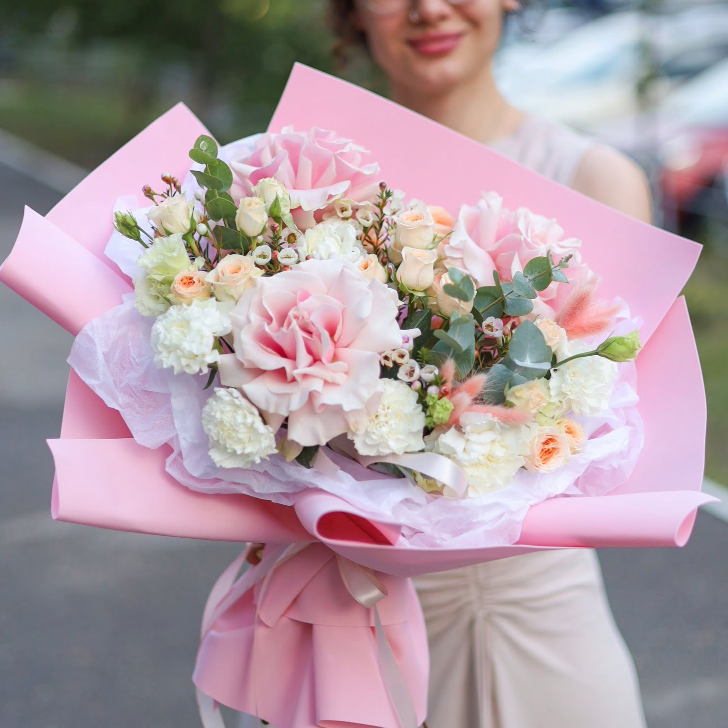 Состав: кустовые и французские розы, стойкие диантусы, ажурная эустома, сухоцветы, ароматный хамелациум и эвкалипт.