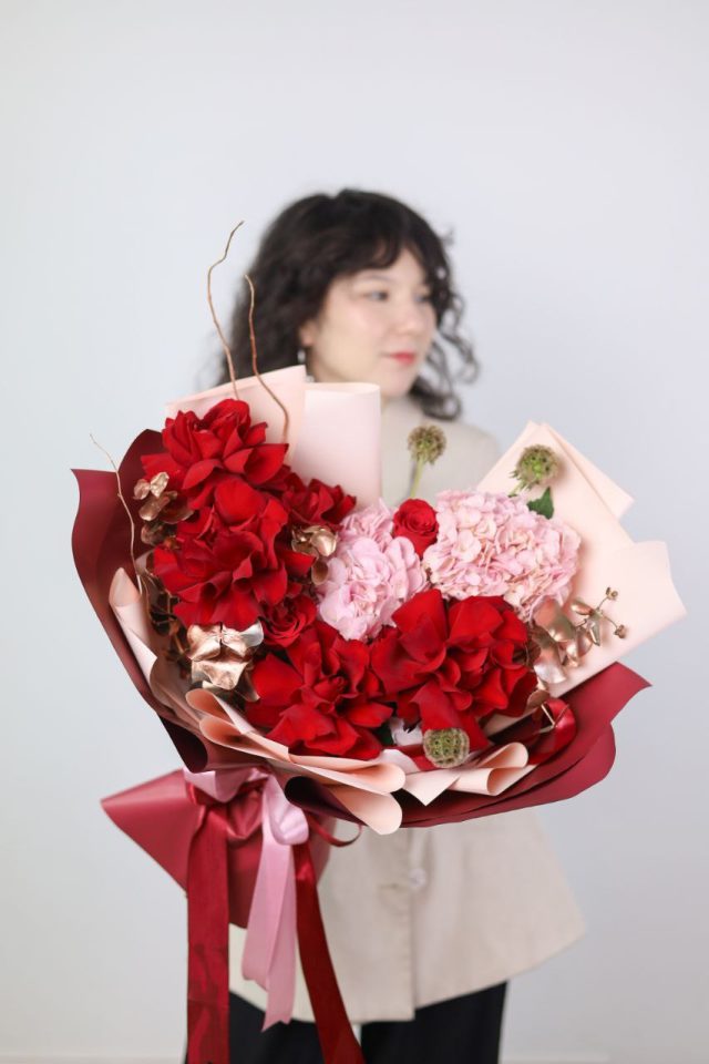 Букет с французской розой, пышной гортензией, скабиозой и эвкалиптом в оформлении.