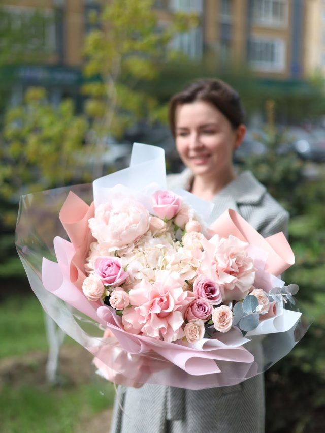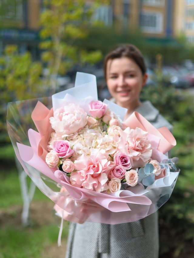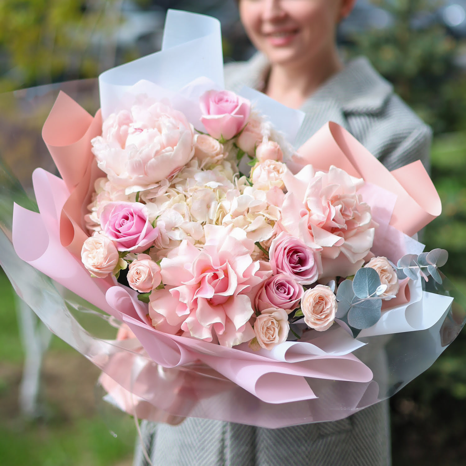В букете: одноголовые и французские розы, пышные гортензии, кустовые пионовидные розы, пион, эвкалипт. Вне сезона пион будет заменен на подходящий цветок.