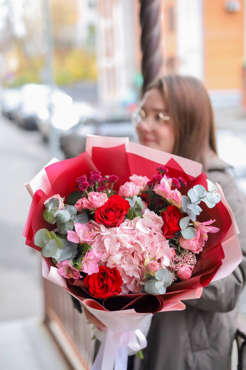 Очаровательный букет в красно-розовой гамме в оформлении.