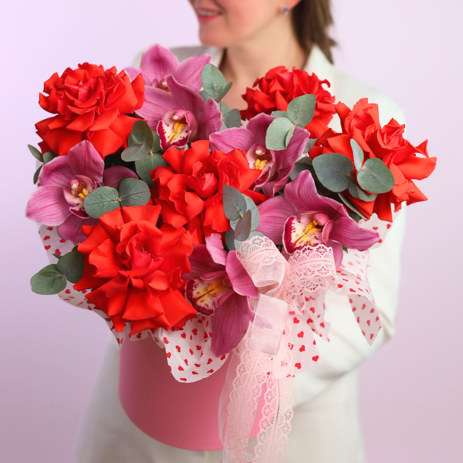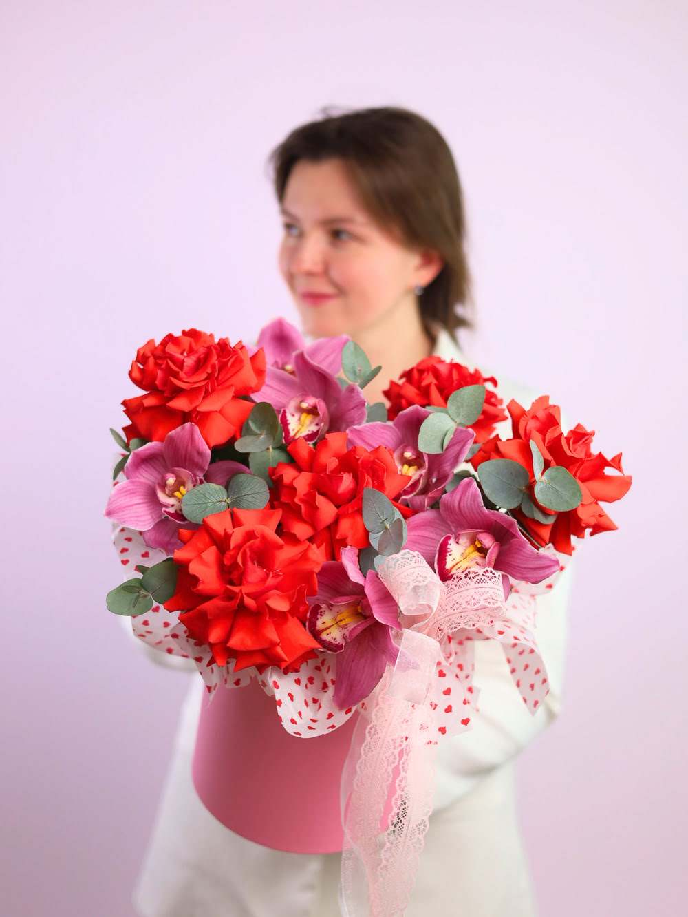 Великолепная композиция в праздничной красно-сиреневой гамме в шляпной коробке.