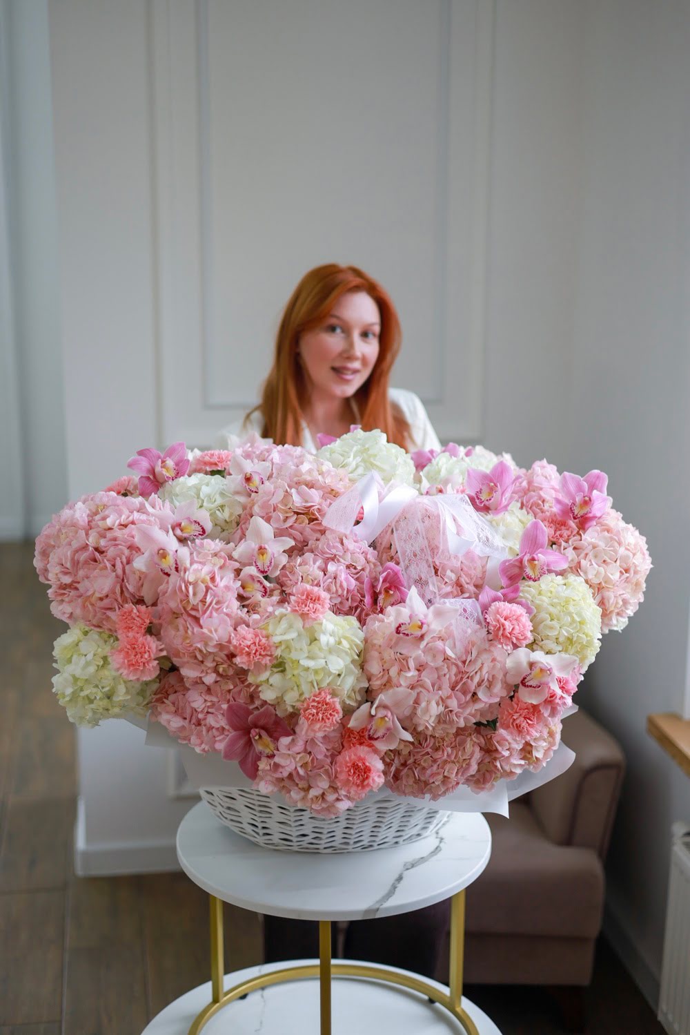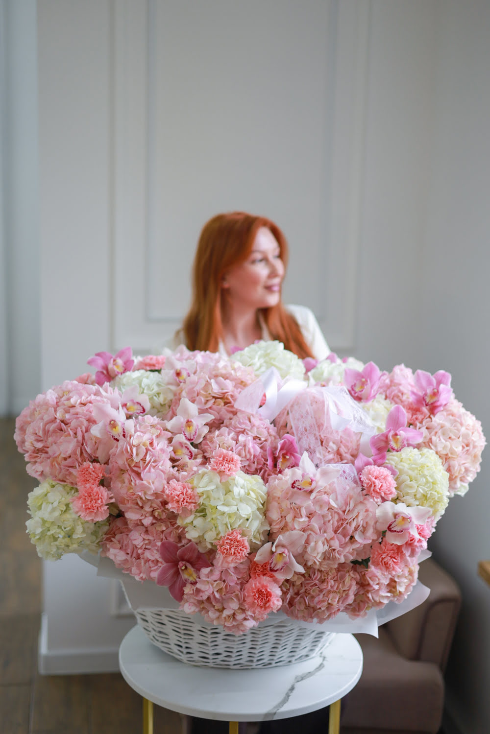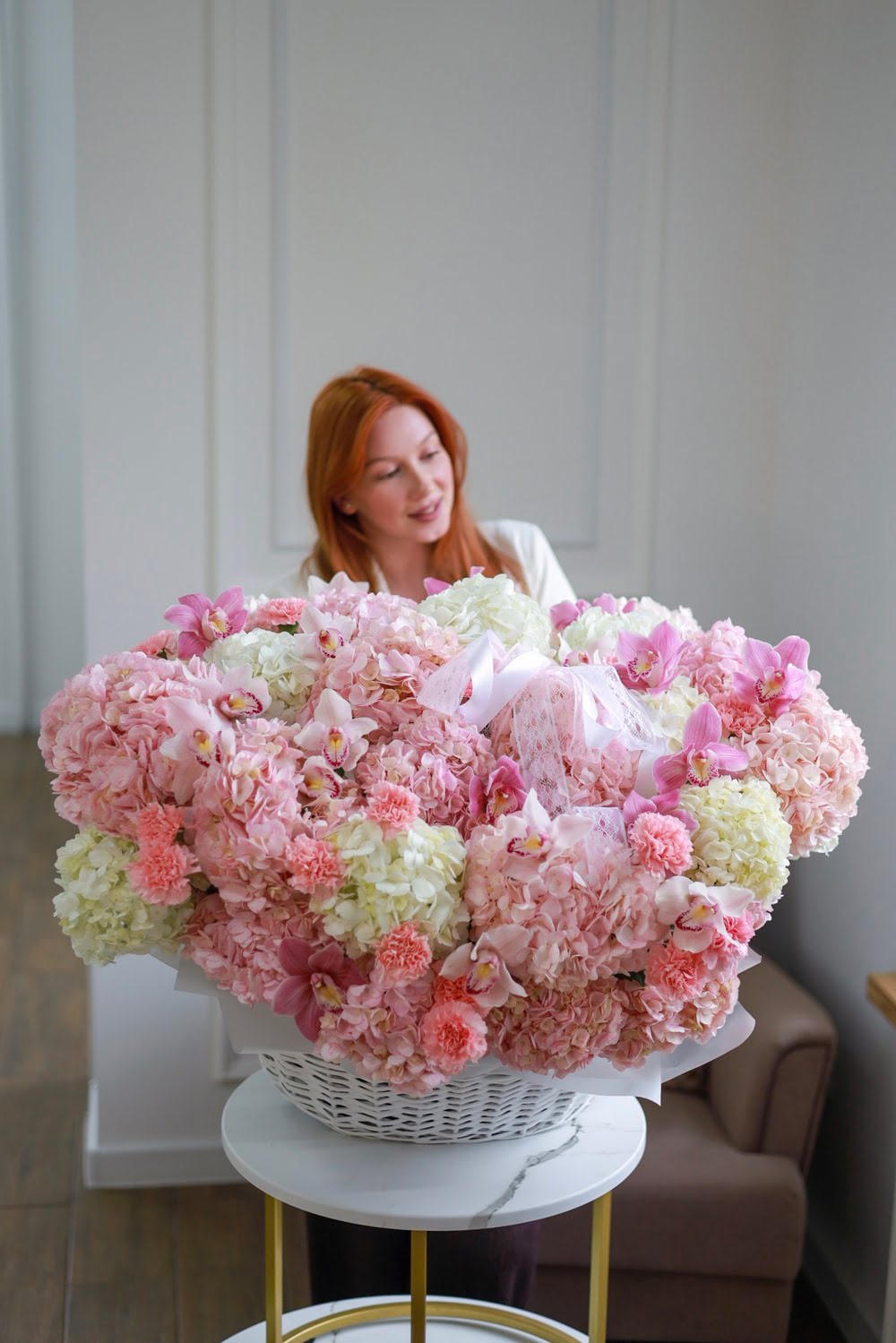 Состав: пышные гортензии, стойкие диантусы и орхидеи.
