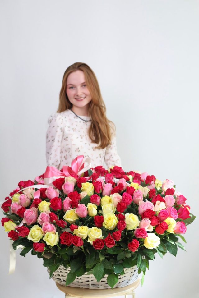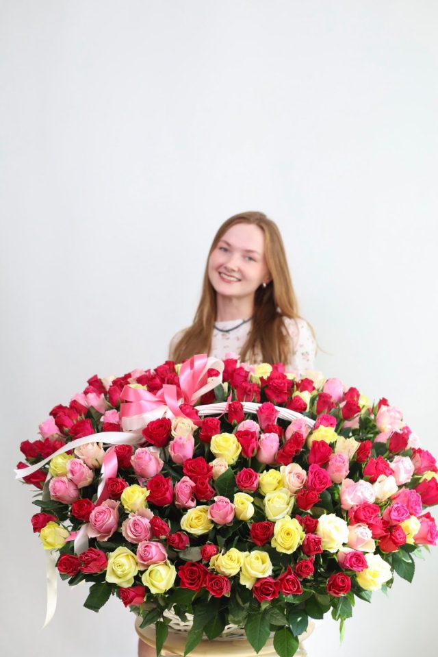 Невероятная композиция из 201-ой розы микс в плетеной корзине.