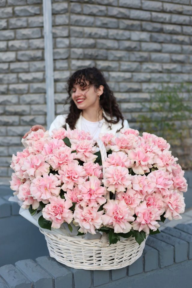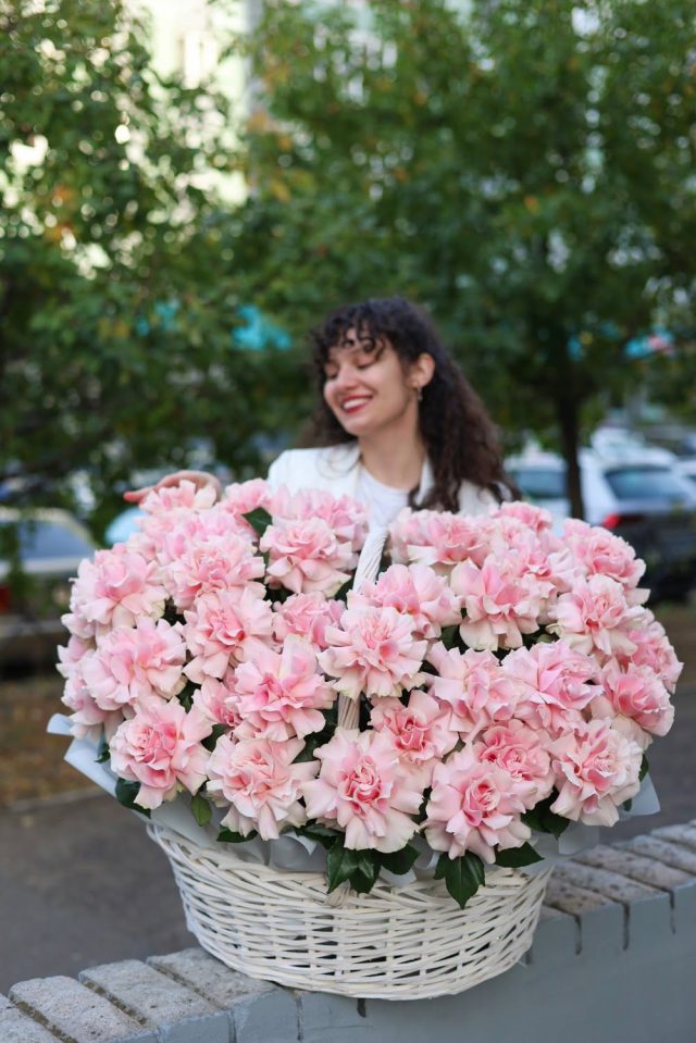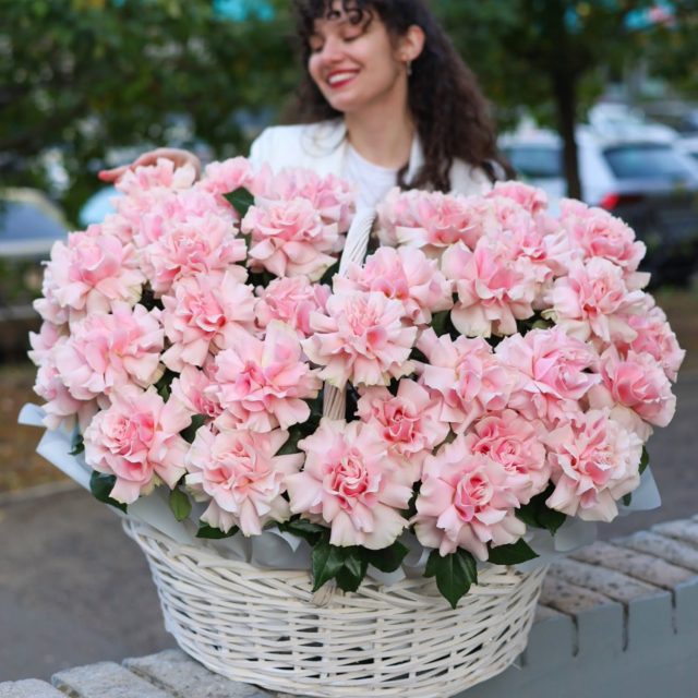 Невероятная корзина из 51-ой ажурной французской розы нежно-розового цвета в плетеной корзине.