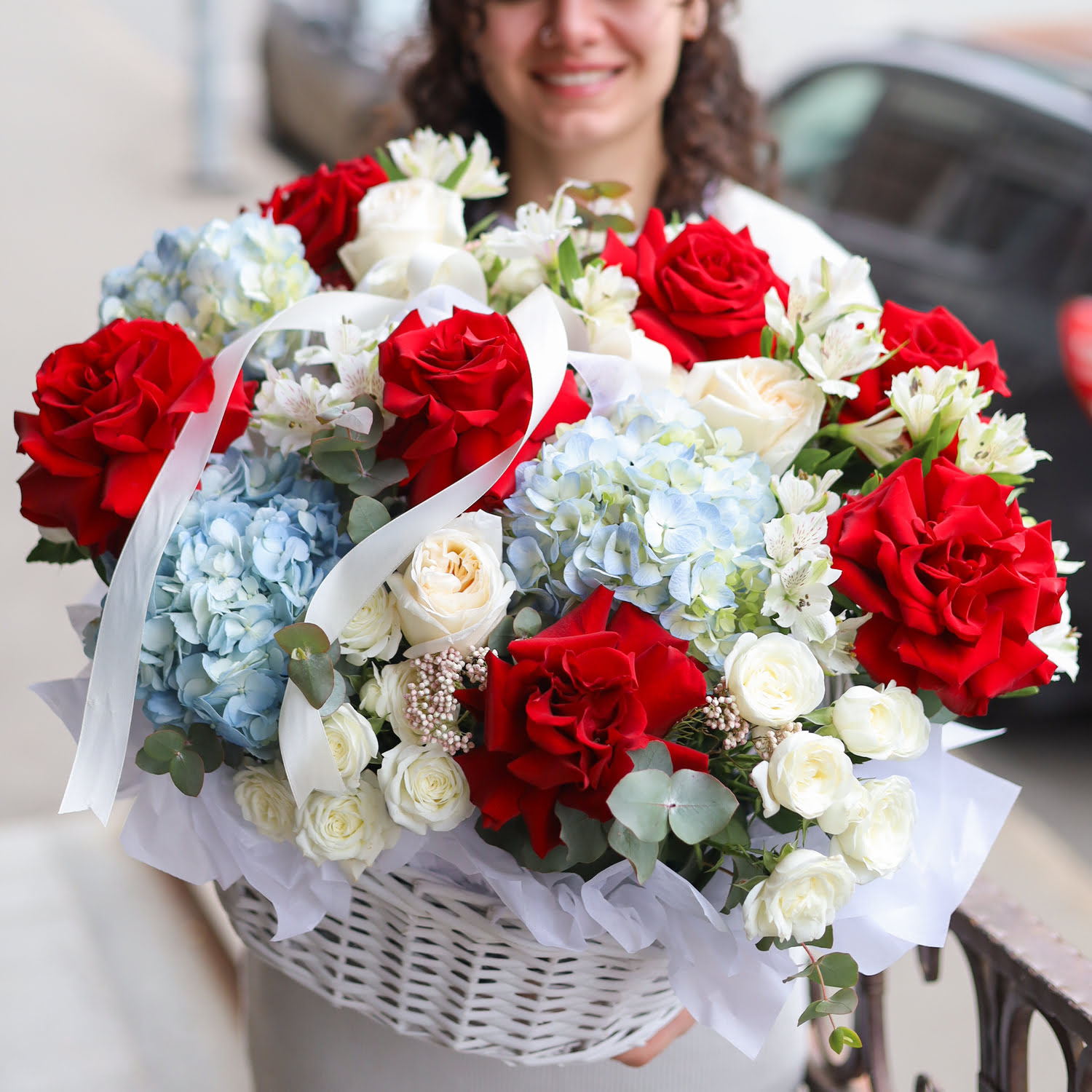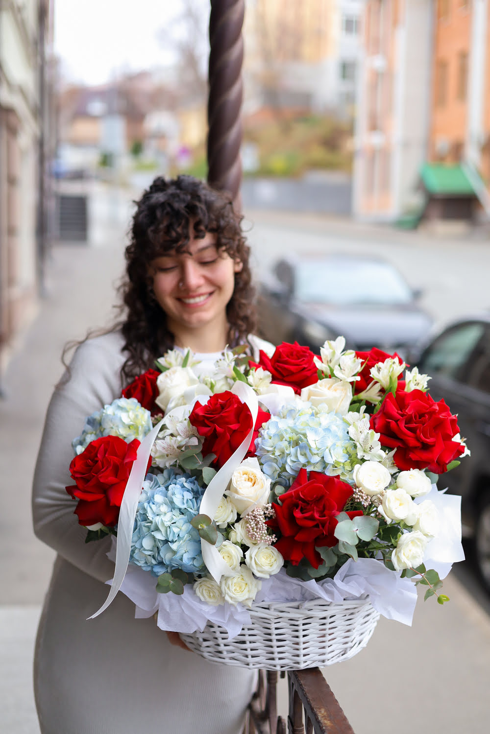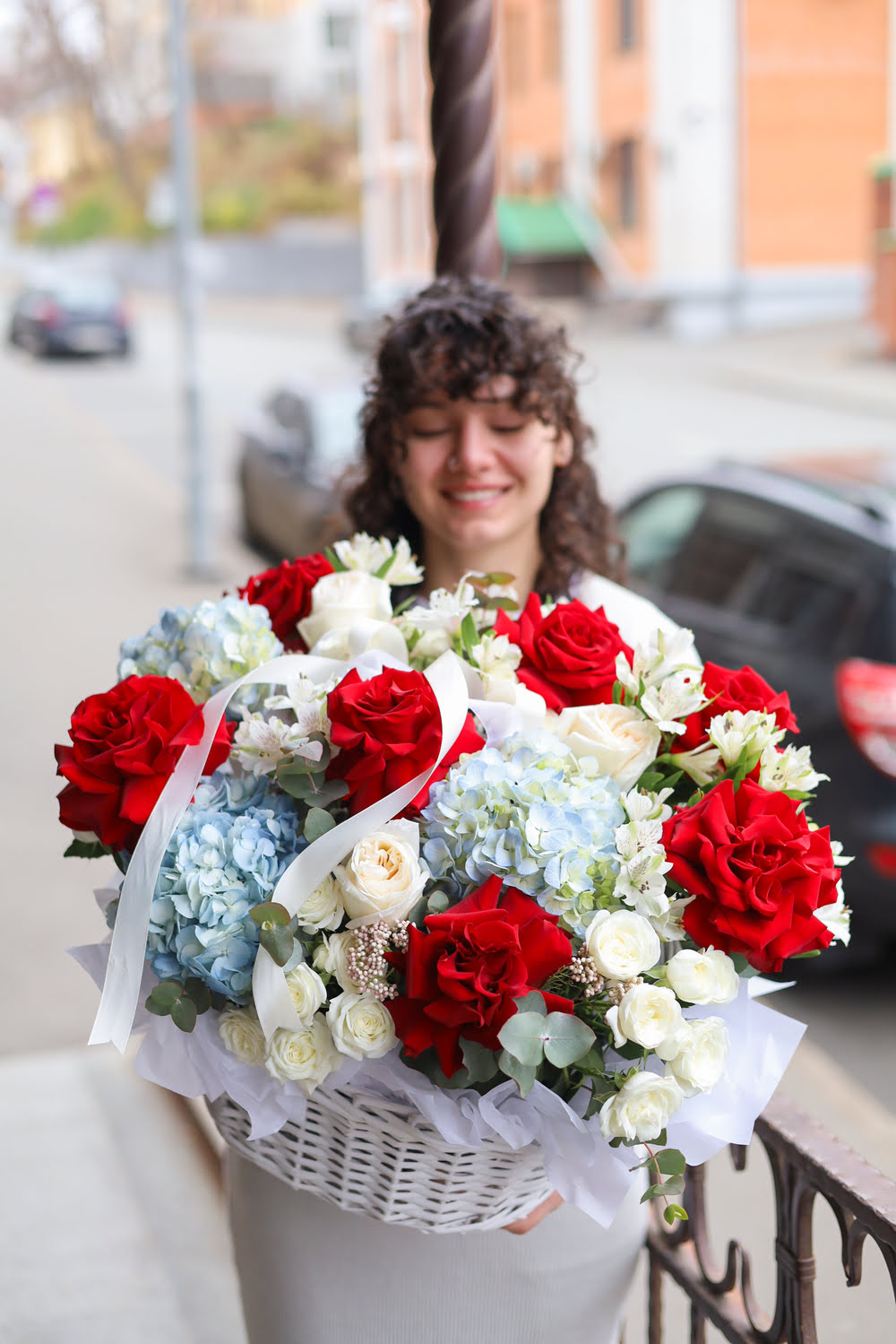 Состав: одноголовые пионовидные розы, пышные гортензии, кустовые и французские розы, стойкая альстромерия, озотамнус, эвкалипт.