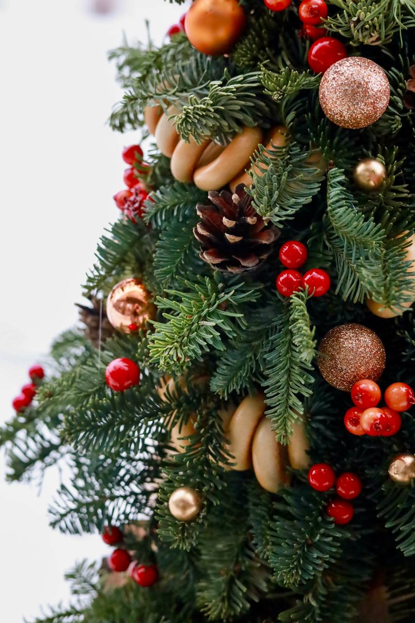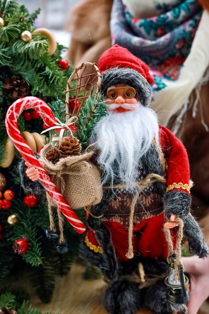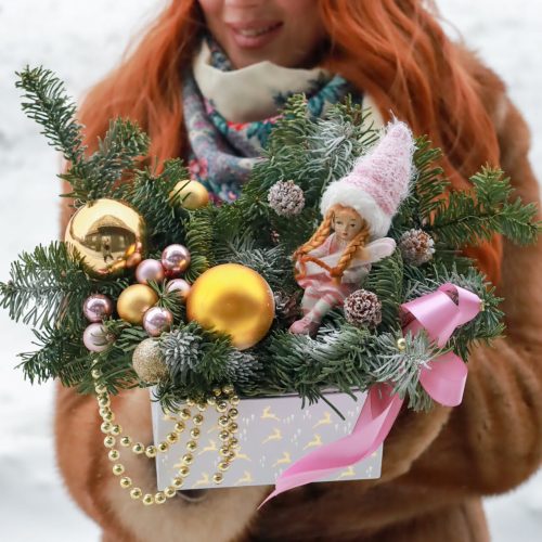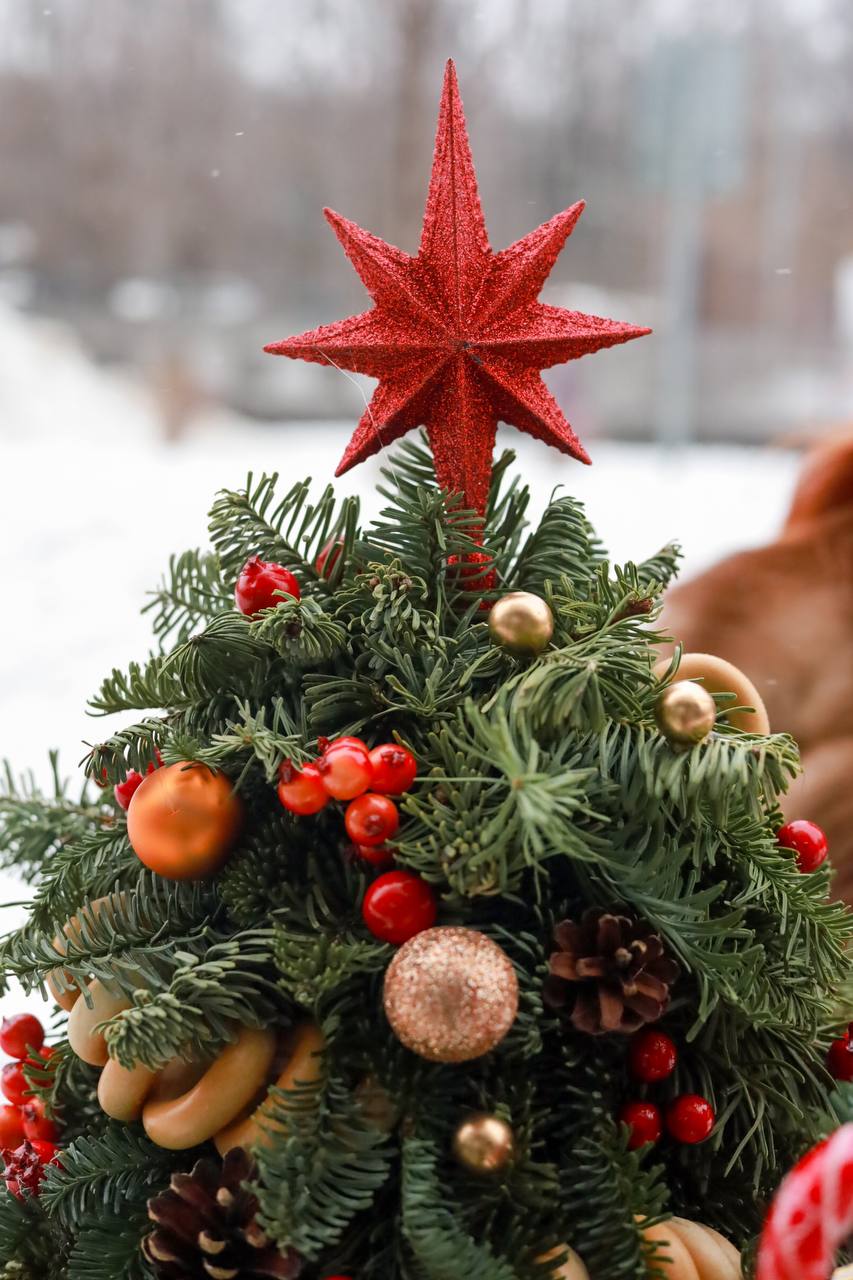 Состав: ёлочка из ароматных хвойных веток, шишки, новогодний декор, связки сушек, яркая звезда. Фигурка Дедушки Мороза с фонарем и сладким леденцом.