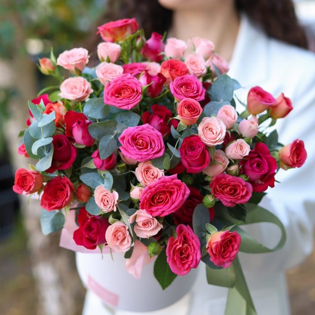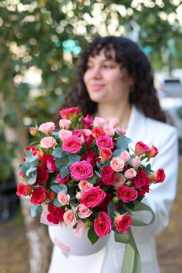 Прекрасная композиция из малиновых и розовых кустовых роз и душистого эвкалипта.