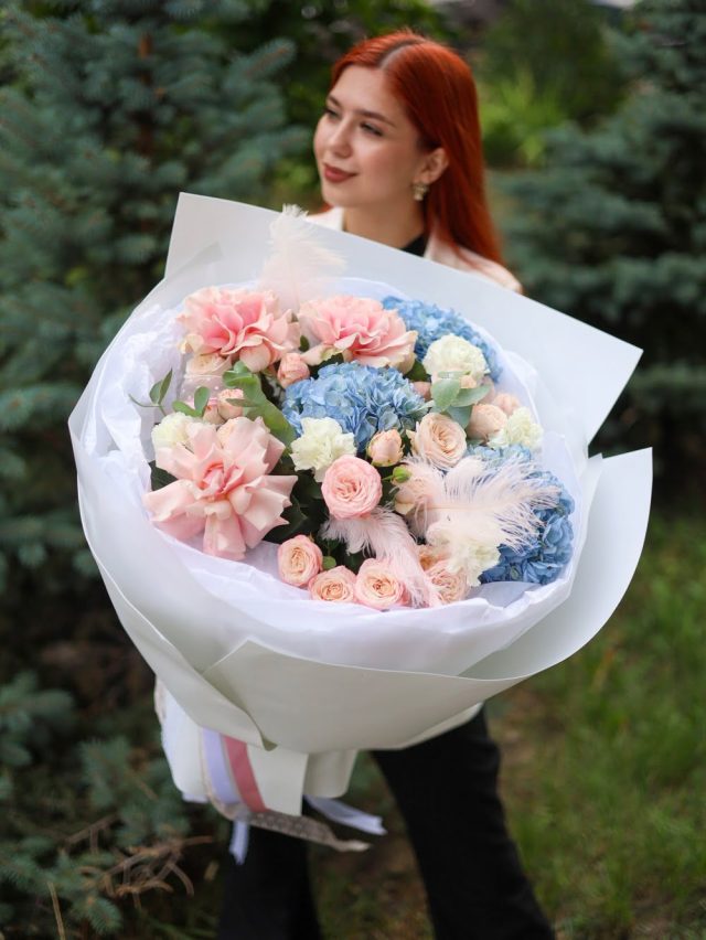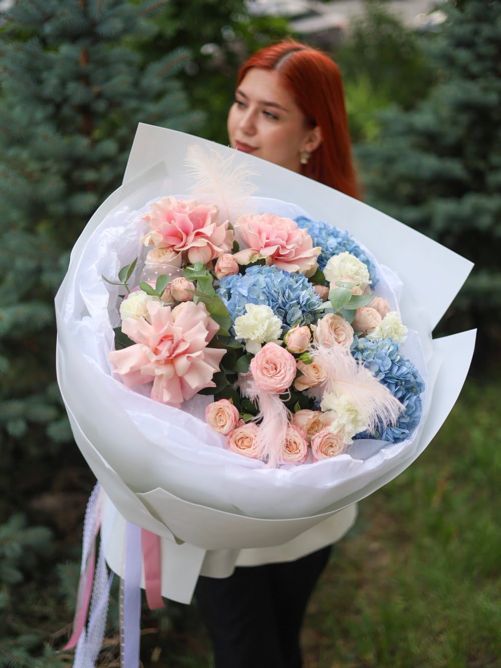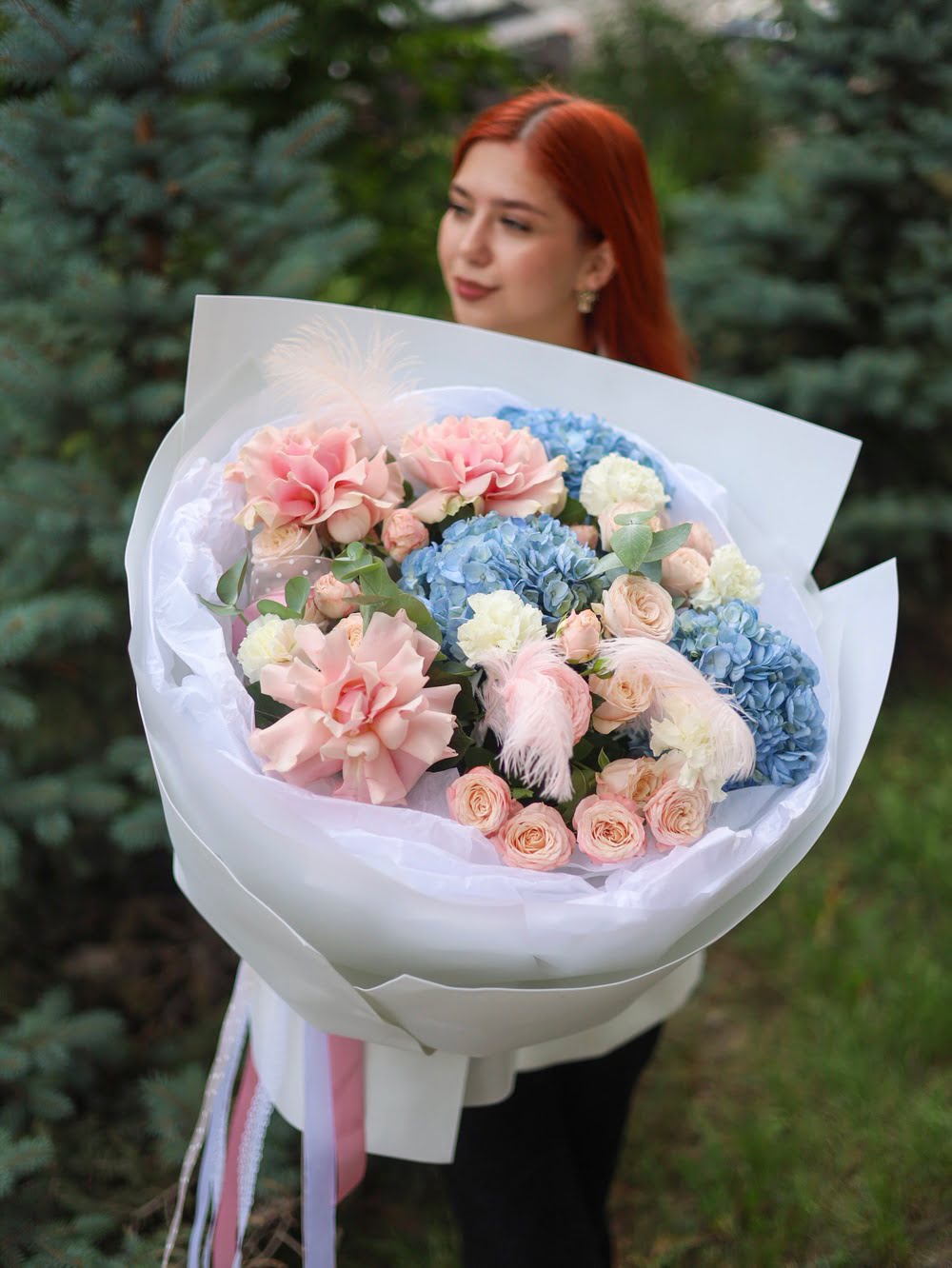 Состав: кустовые пионовидные розы, пышные гортензии, стойкие диантусы, французские розы, эвкалипт.