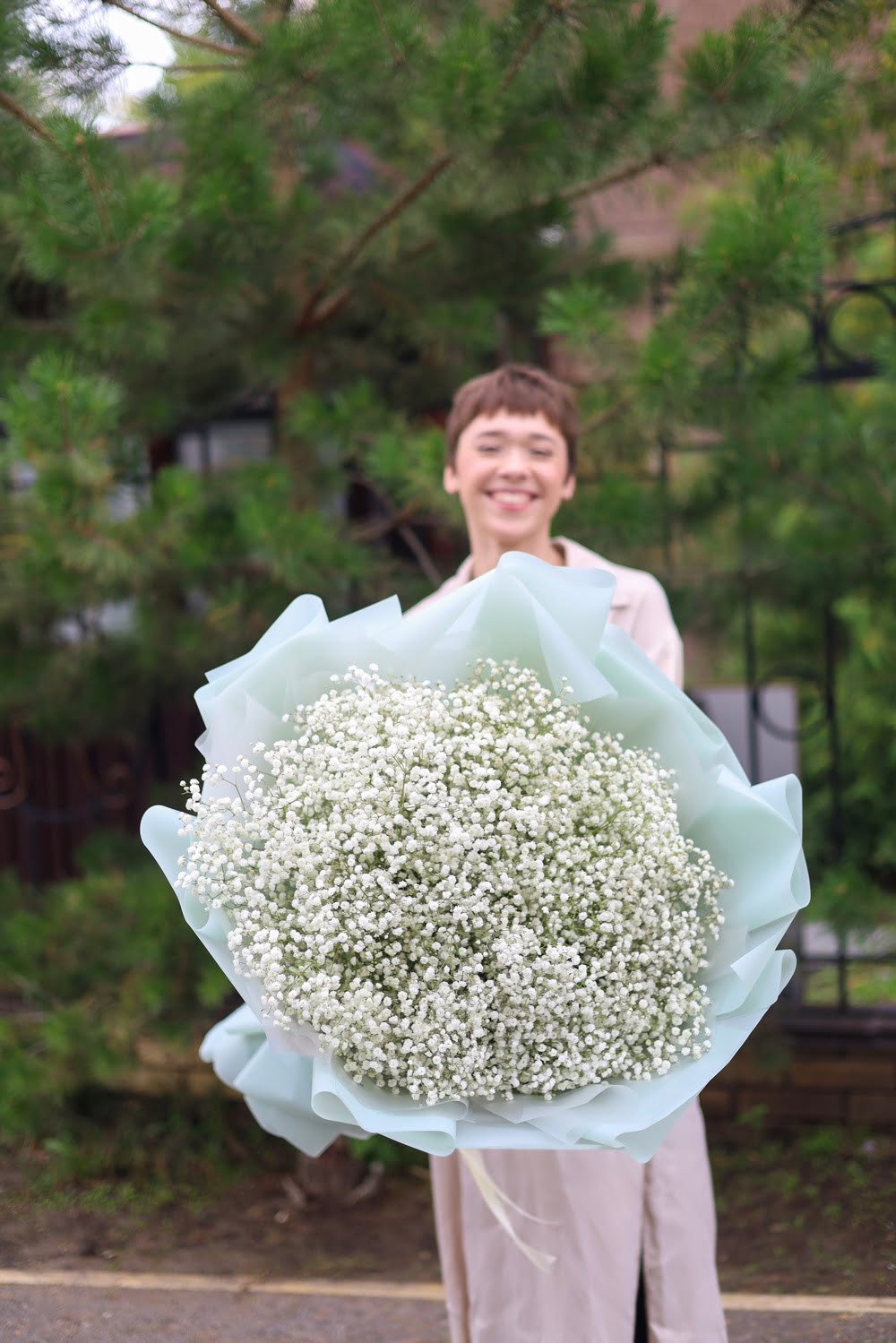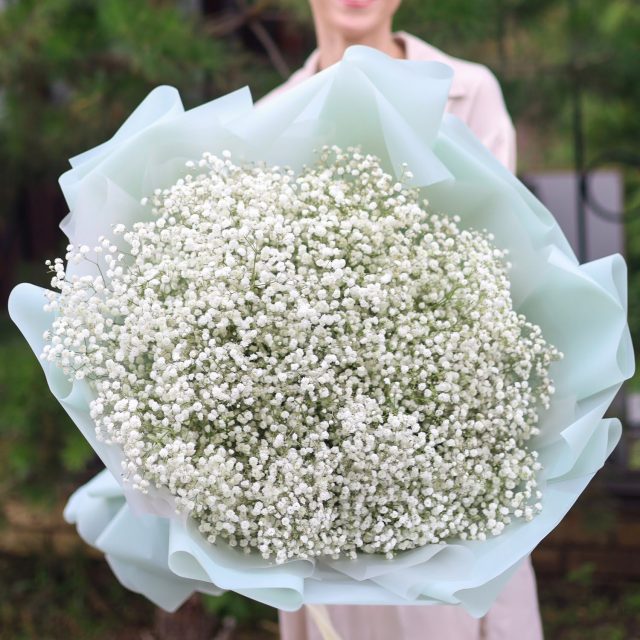 Букет – гигант из 25-ти веток пышной и стойкой белой гипсофилы в стильном оформлении.