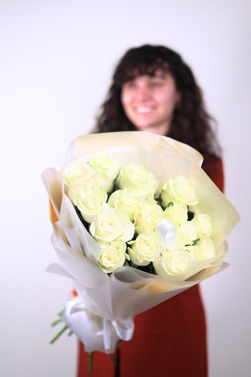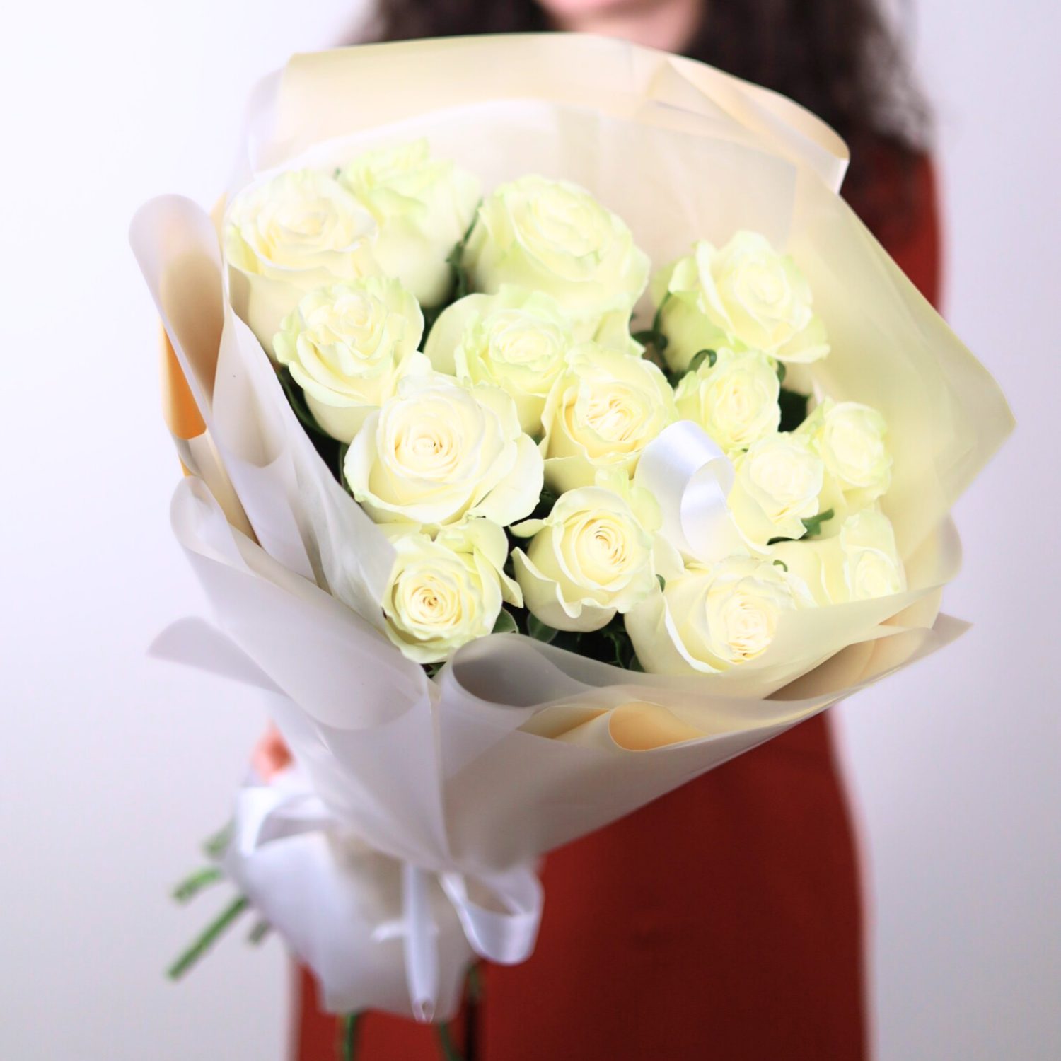 Прекрасный букет из 15-ти крупных белых роз сорта Мондиаль в оформлении.