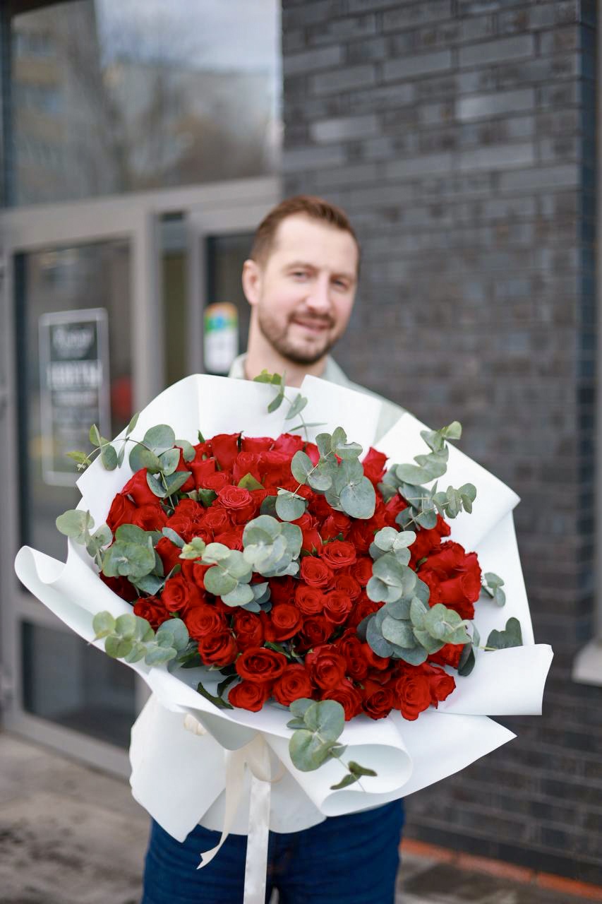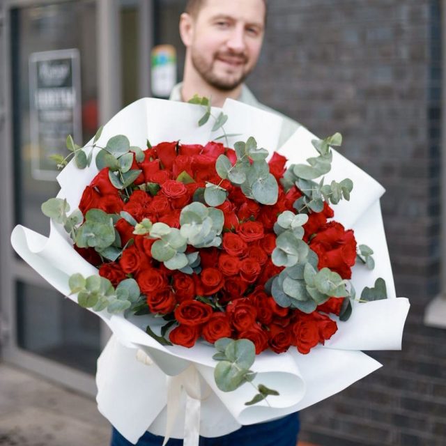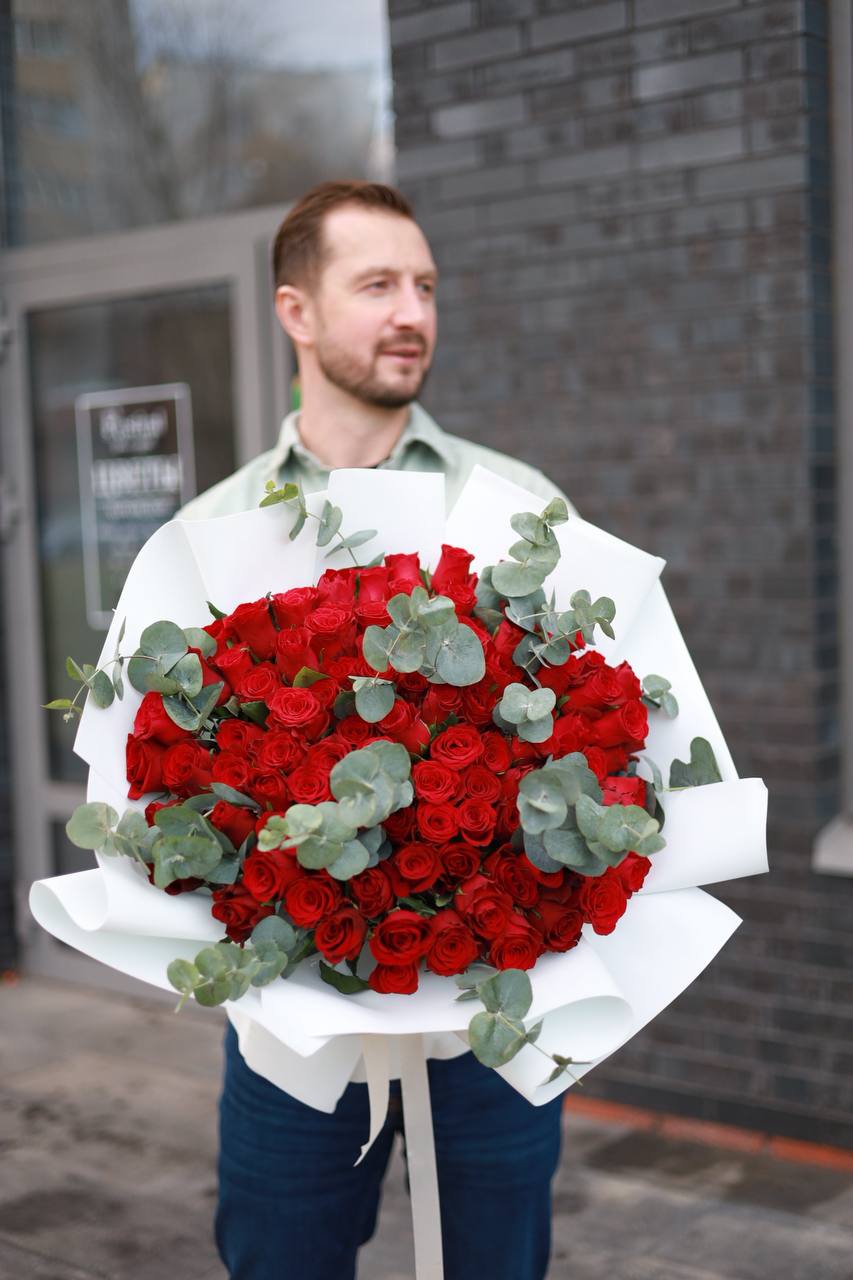 Великолепный большой букет насыщенных красных роз с душистым эвкалиптом в оформлении. Настоящая классика!