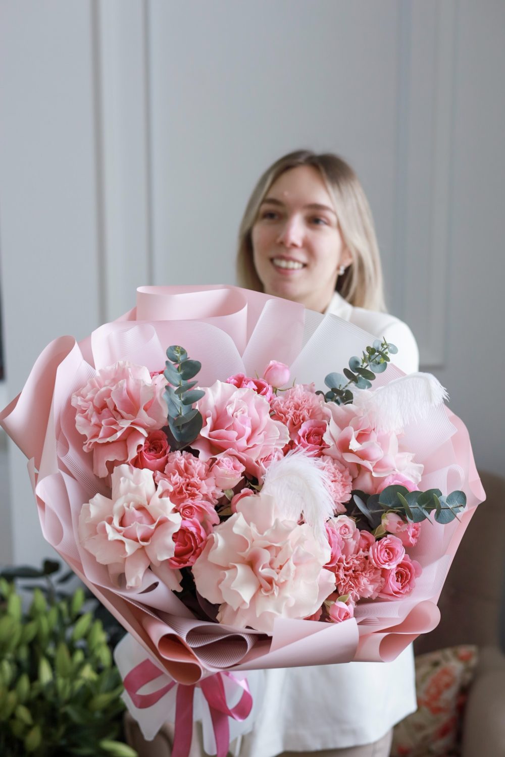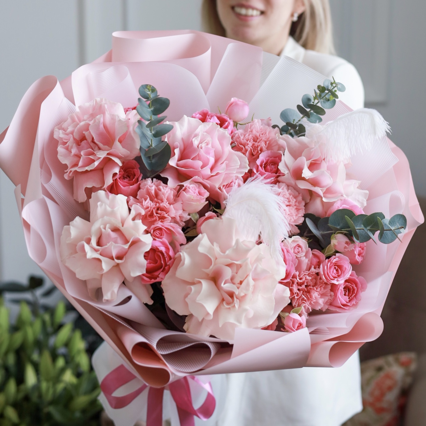 Состав: кустовые и одноголовые розы, стойкие диантусы, крупные французские розы, эвкалипт, перо.