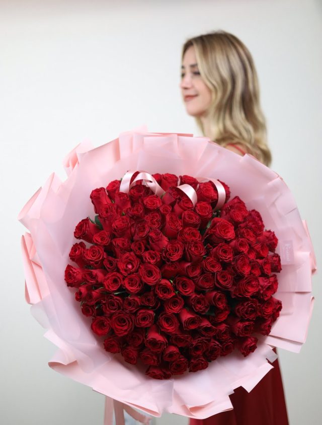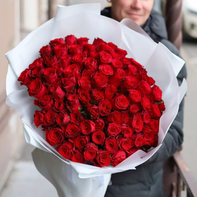 Роскошный букет красных бархатных роз в стильном оформлении.