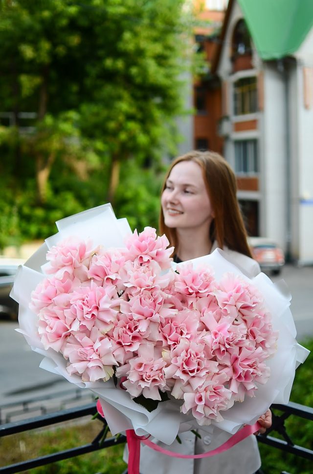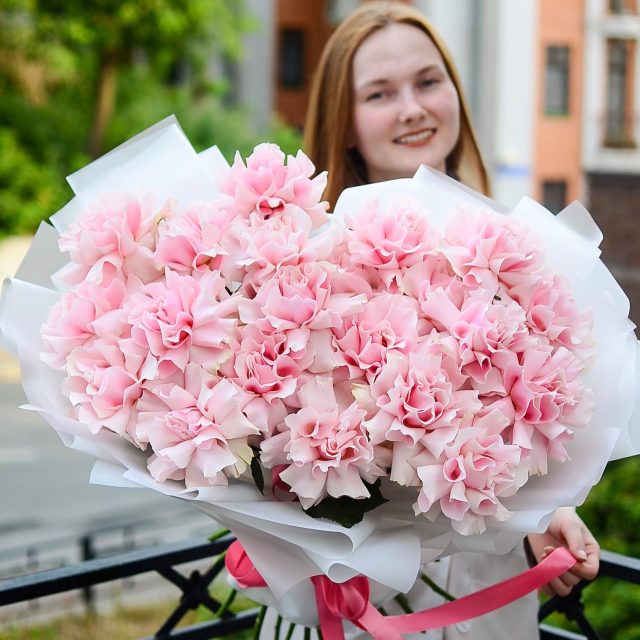 Великолепный букет из 21-ой крупной французской розы элегантного розового цвета. Букет оформлен в корейскую пленку и украшен атласными лентами.