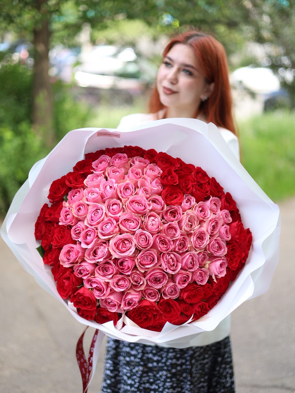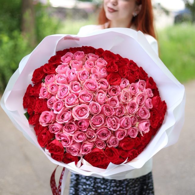 Великолепный объемный букет из 101-ой красной и розовой розы в стильном оформлении.