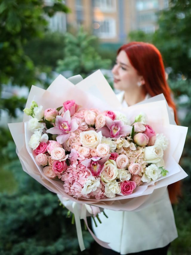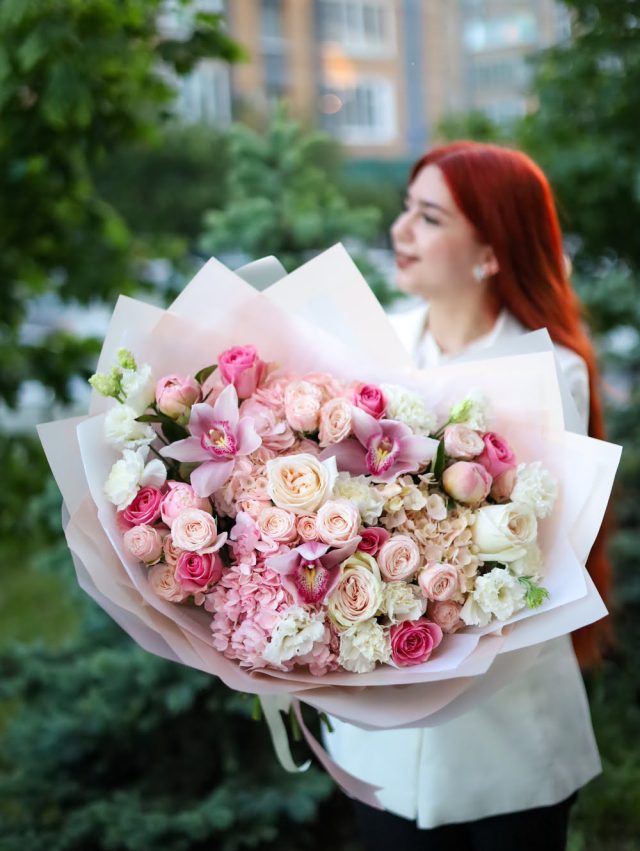 В букете: пышные гортензии, розовые пионы, одноголовые и кустовые пионовидные розы, стойкие диантусы и орхидея, ажурная эустома, одноголовые розы. Высота около 50 см.
