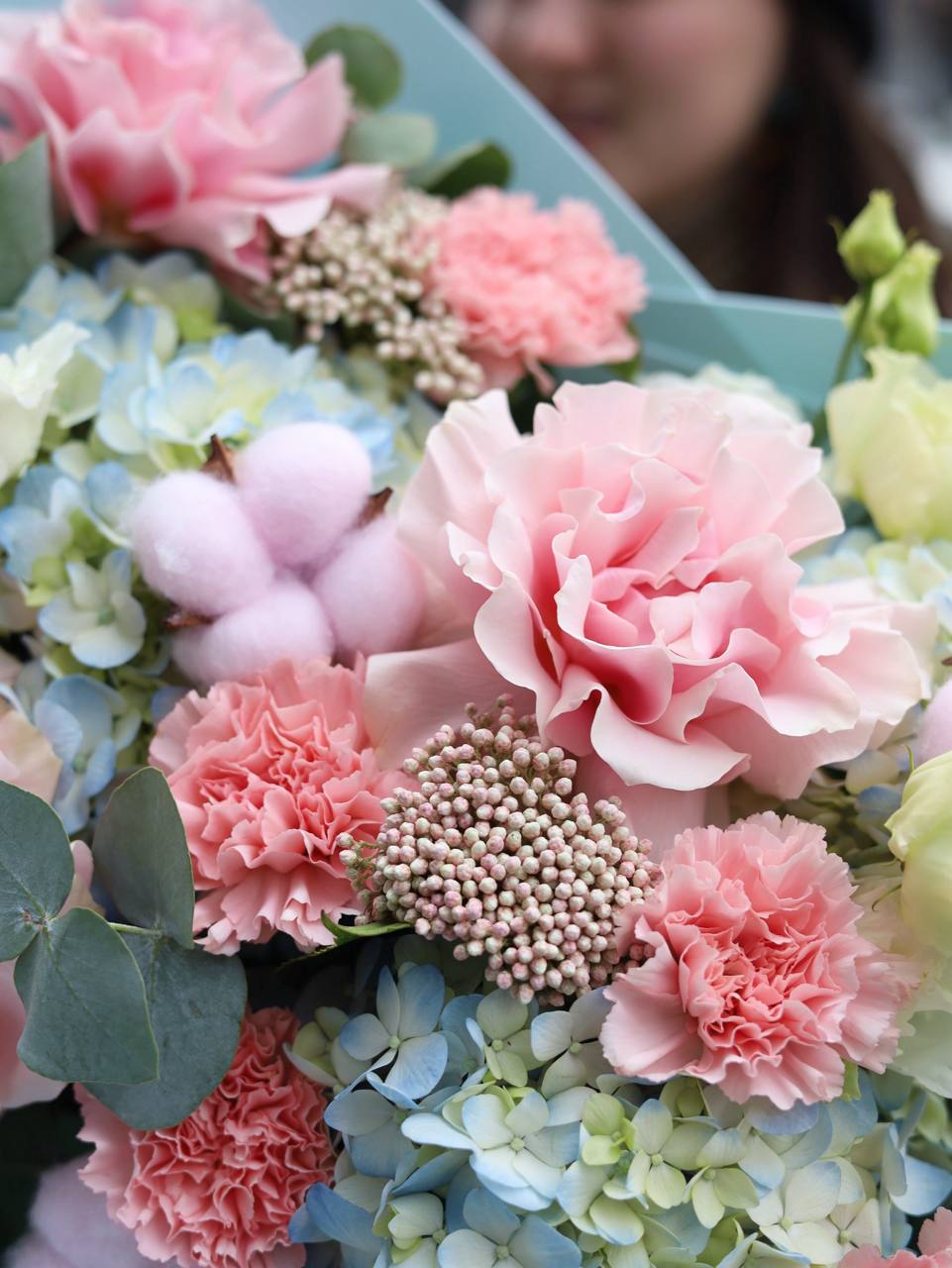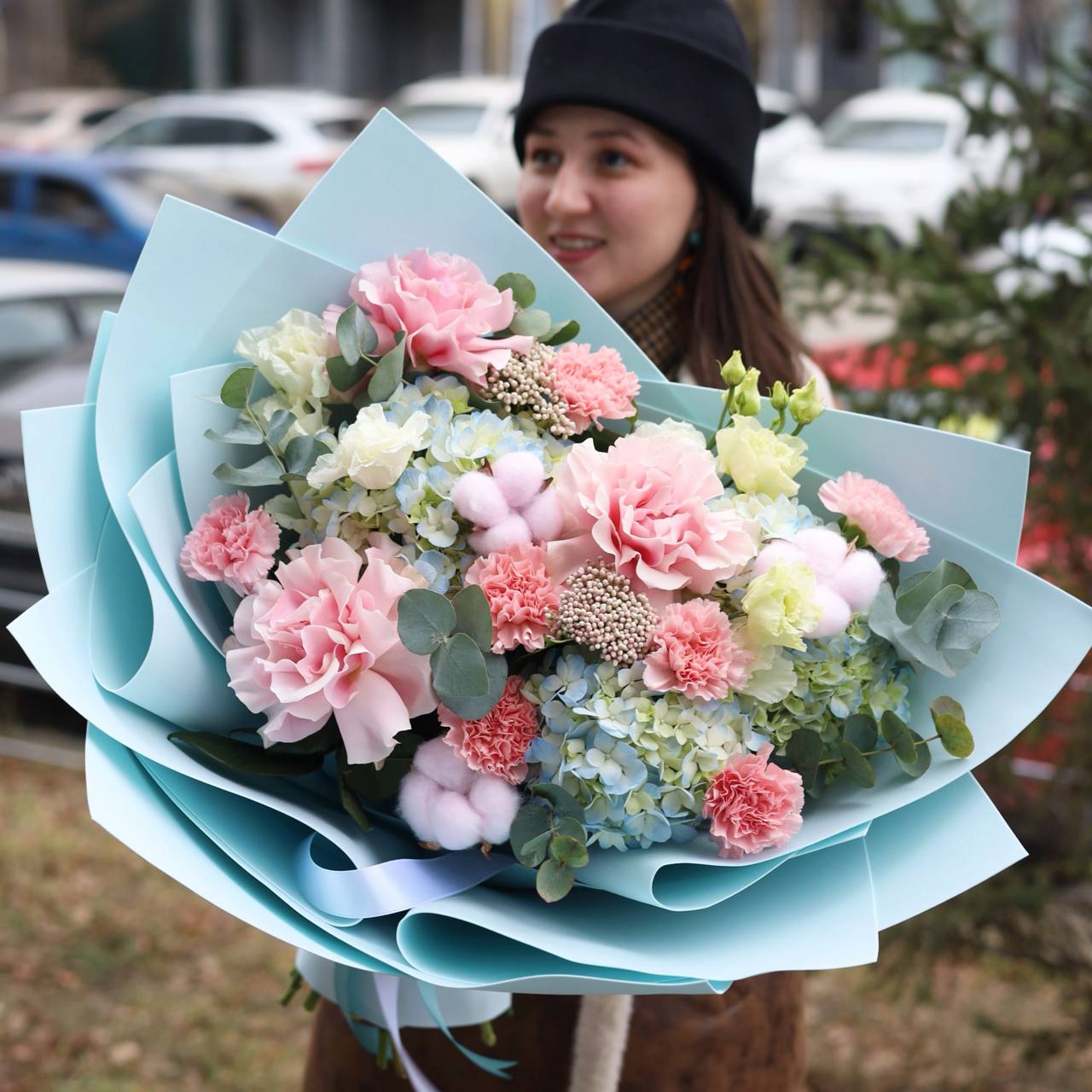 Великолепный объемный букет в нежной гамме с пышной голубой гортензией, французскими розами, стойкими диантусами, озатамнусом, эустомой и душистым эвкалиптом в оформлении.