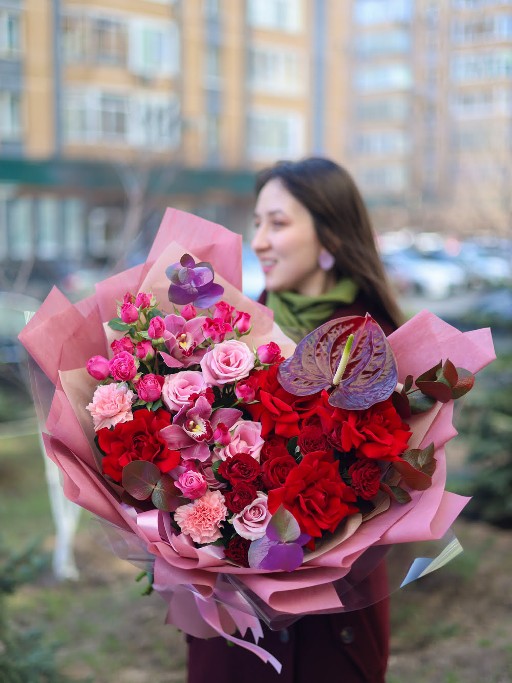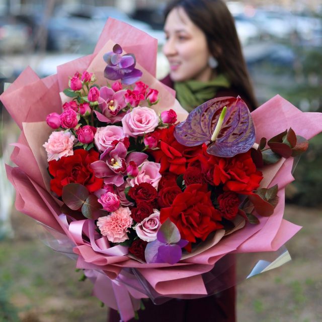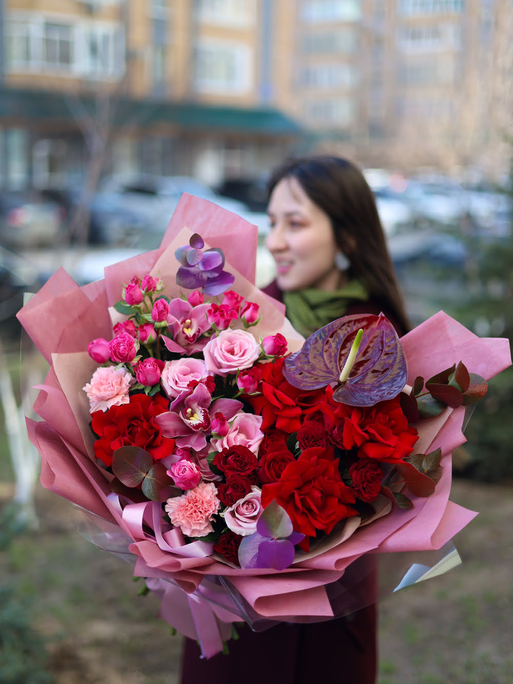 Состав: кустовые и одноголовые розы, антуриум, стойкие диантусы и орхидеи, французские розы, крашеный эвкалипт.