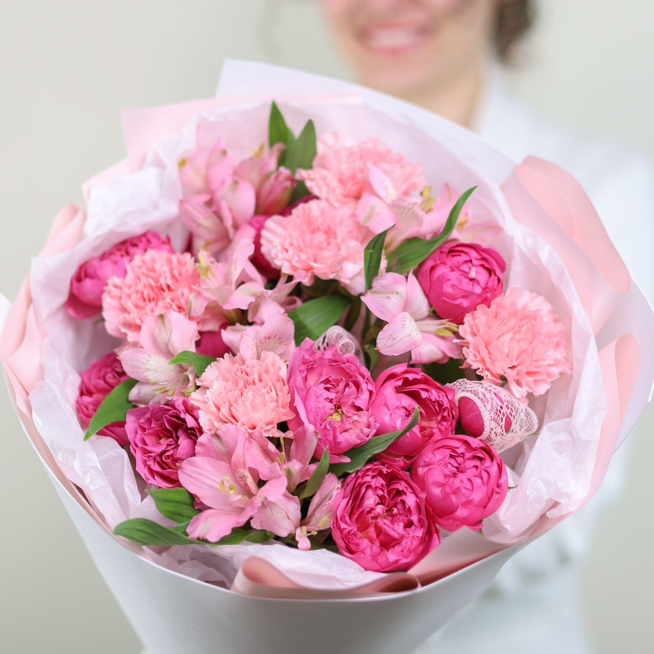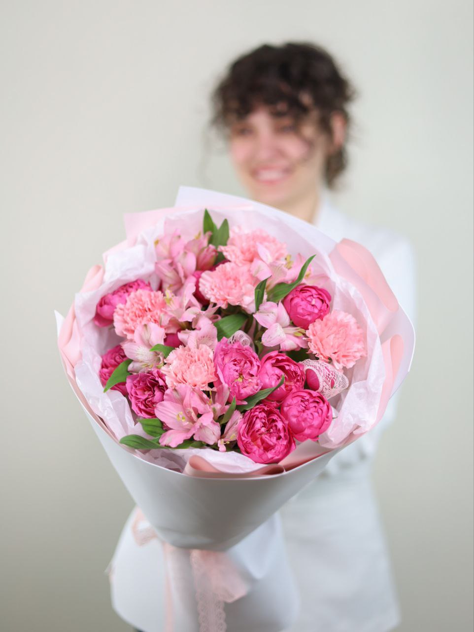 Букет с пышной альстромерией, стойким диантусом и пионовидной кустовой розой в оформлении.