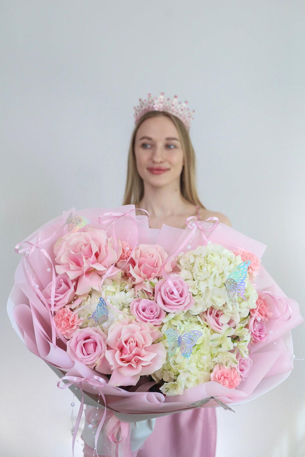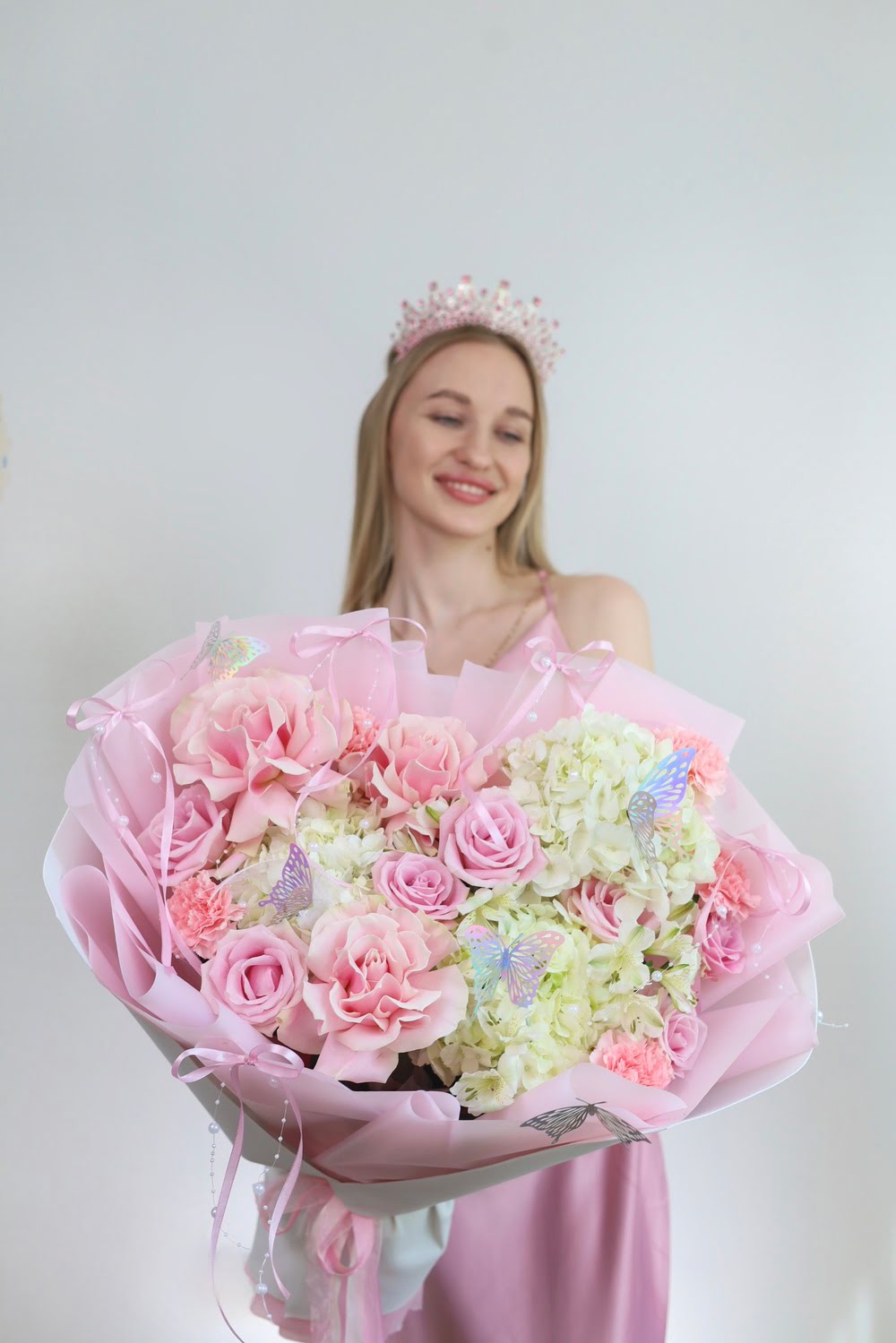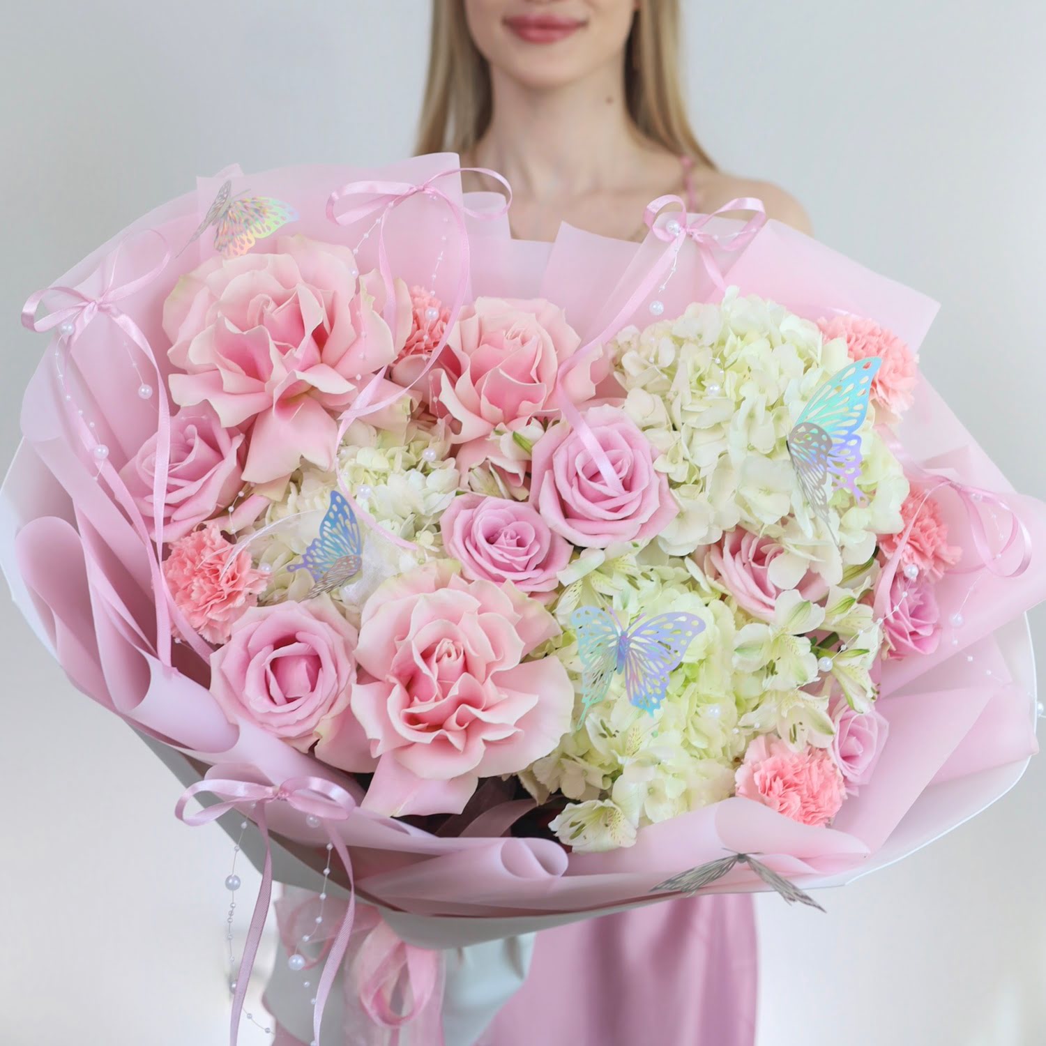 Состав: крупные французские розы, пышные гортензии, стойкие диантусы и альстромерия, одноголовые розы.