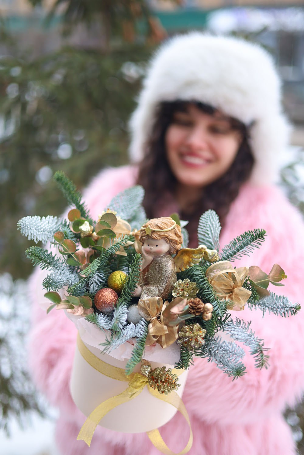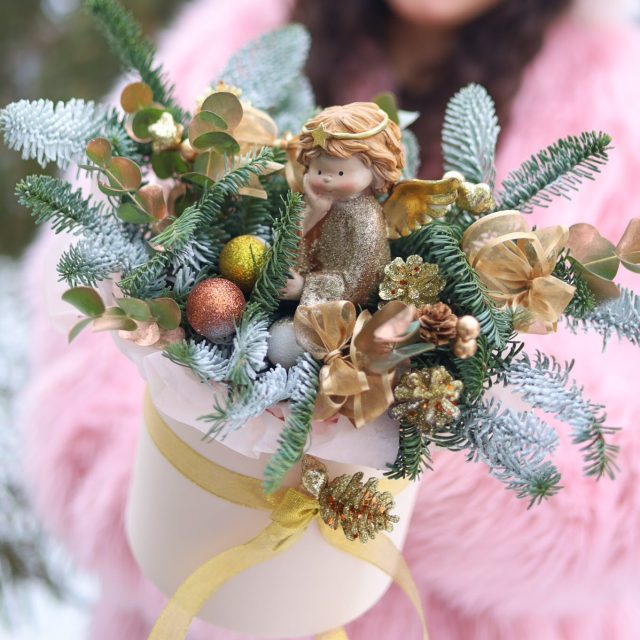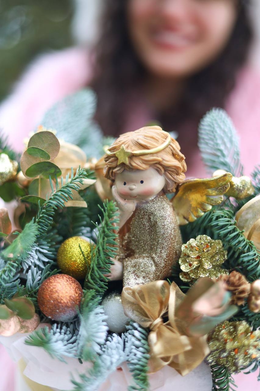 Состав: елочные игрушки, крашеные шишки и эвкалипт, датская ель нобилис, фигурка ангела. Высота около 30-35 см.
