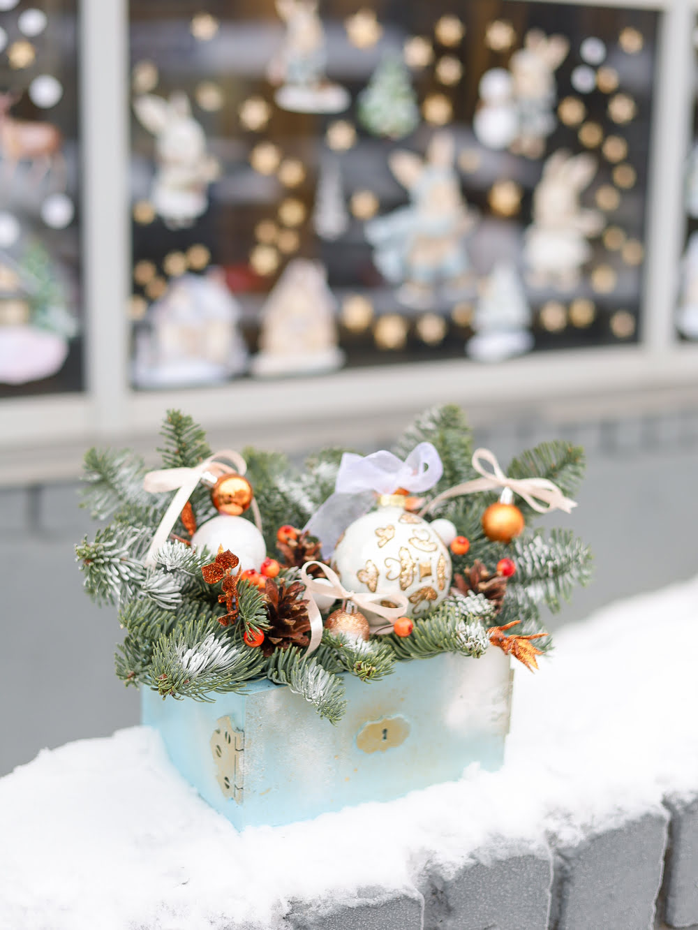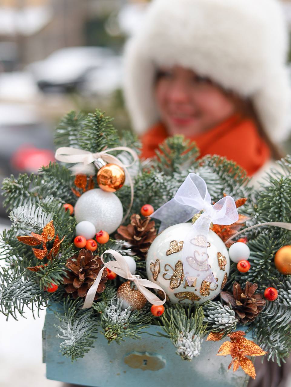 Состав: ель нобилис, шишки, ёлочные игрушки.