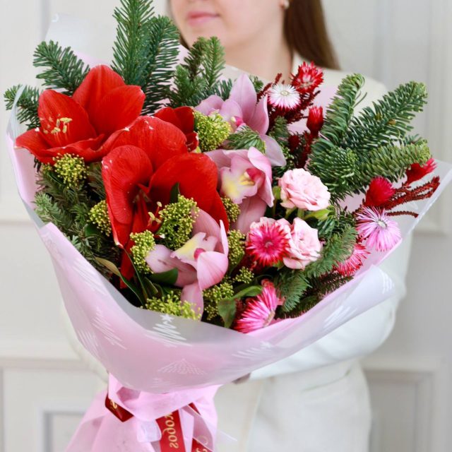 В составе: экзотический амариллис, орхидеи, скимия, доротеантус и ветки нобилиса.