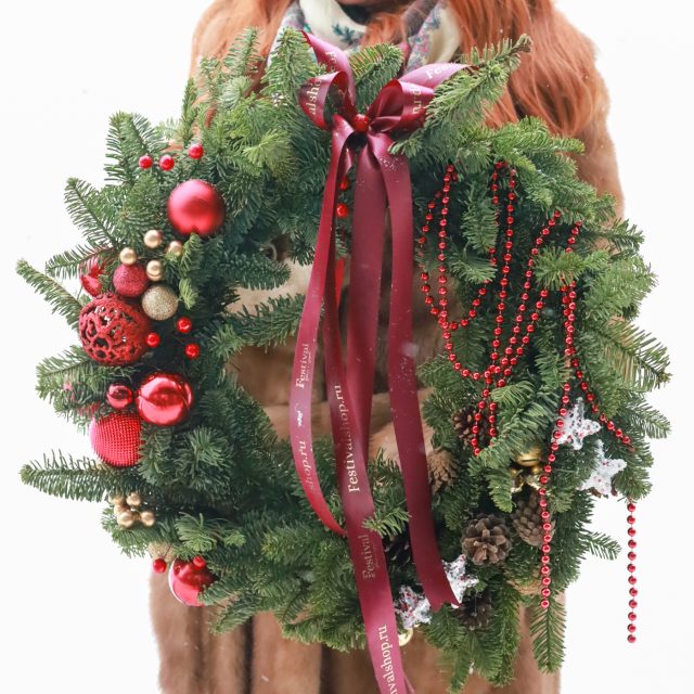 Состав: натуральная ель нобилис, елочные игрушки, шишки, бусы, декор.