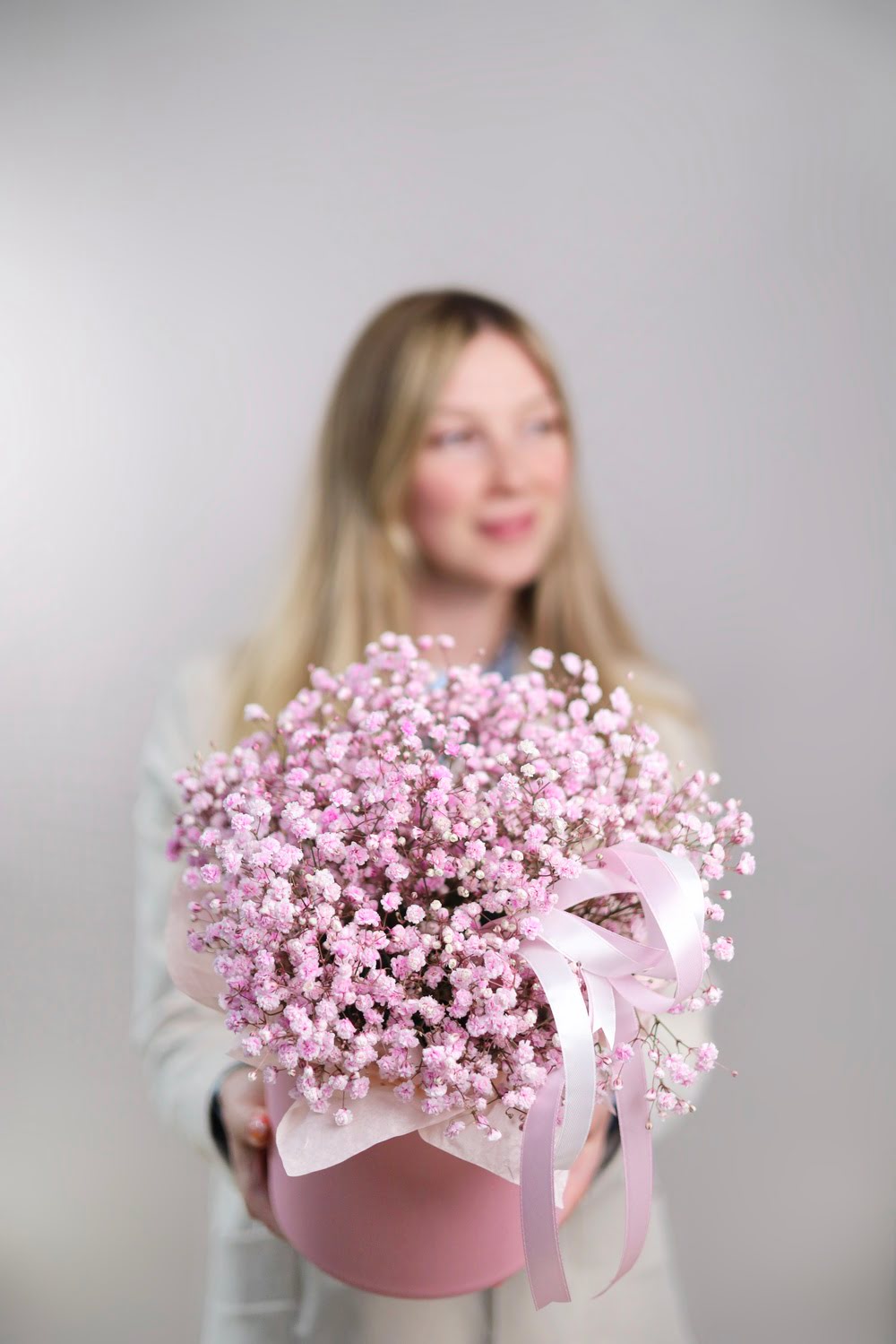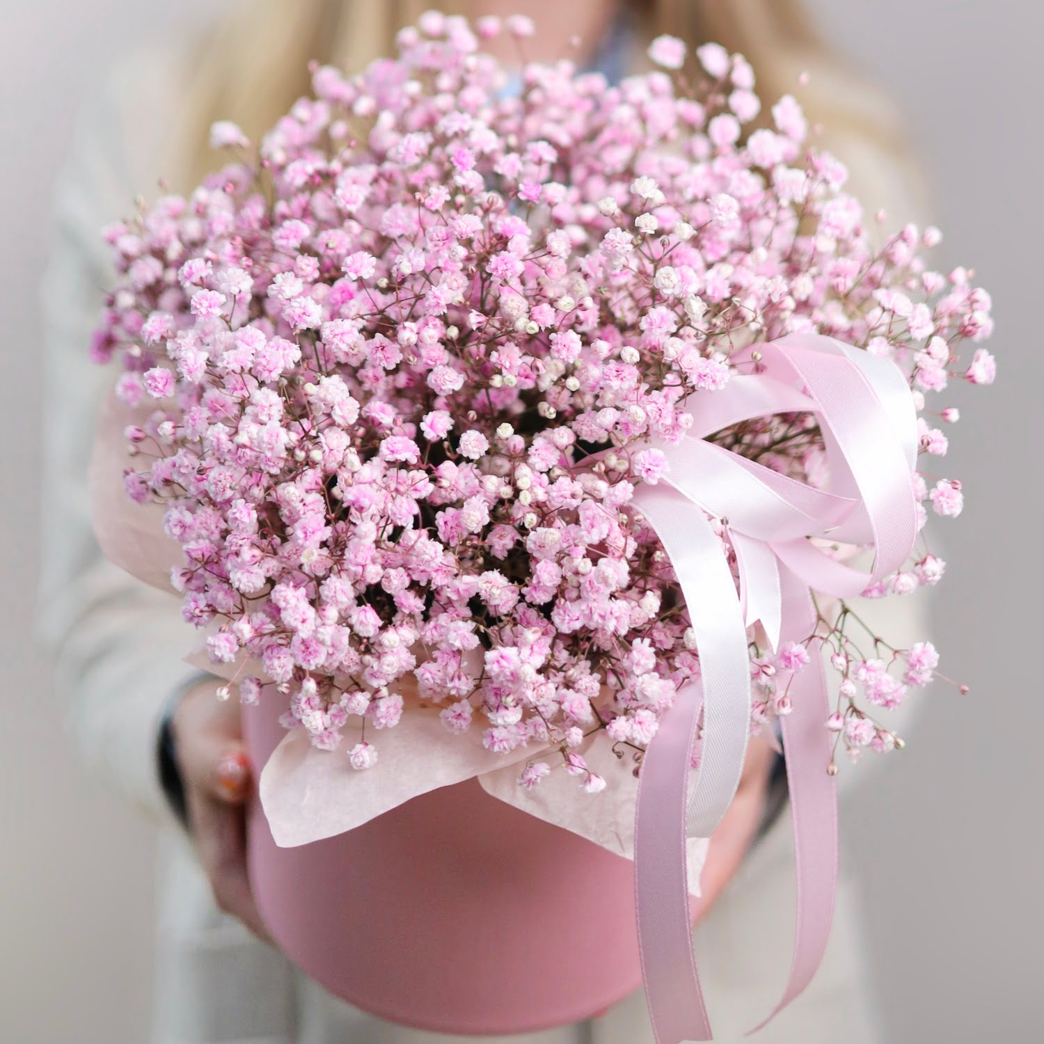 Розовая гипсофила в шляпной коробке